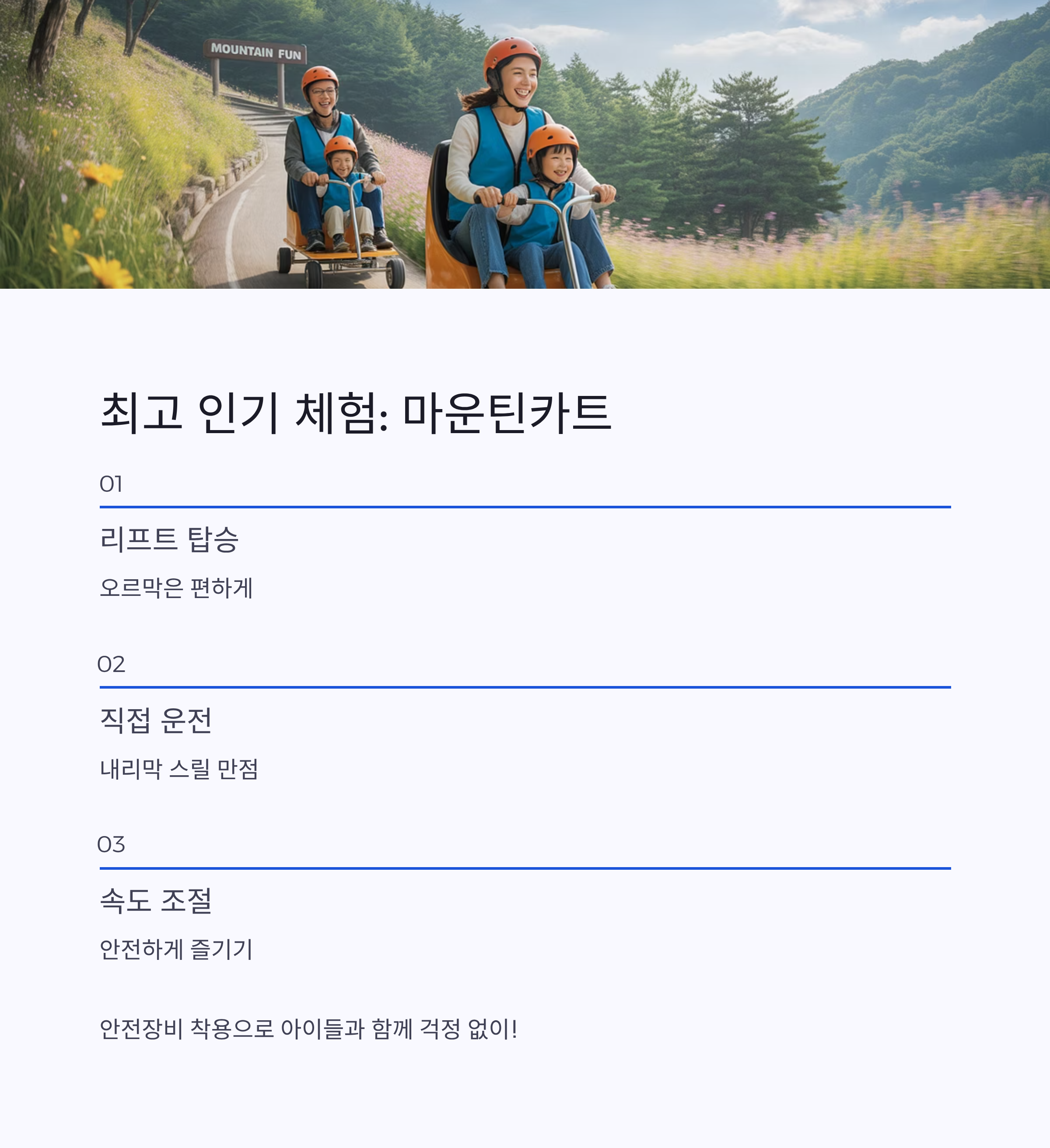 | 마운틴카트 | 언덕을 따라 스릴 있게 내려오는 레이싱 체험 |