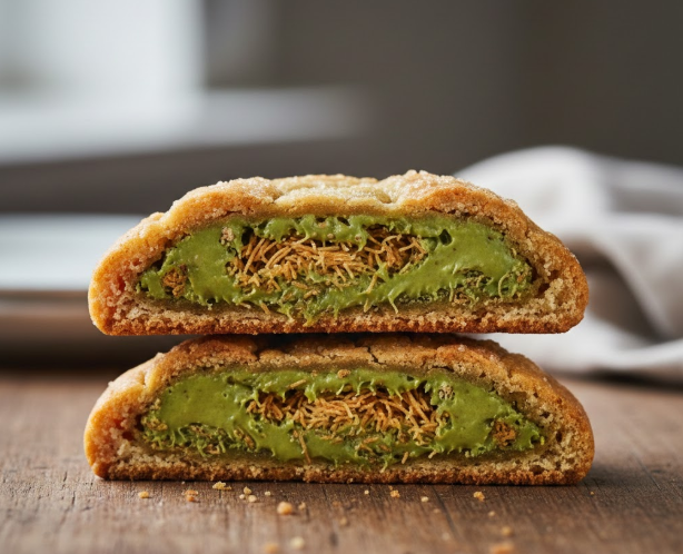 고급스러운 피스타치오 색감의 두바이 쫀득 쿠키가 반으로 갈라져 카다이프가 듬뿍