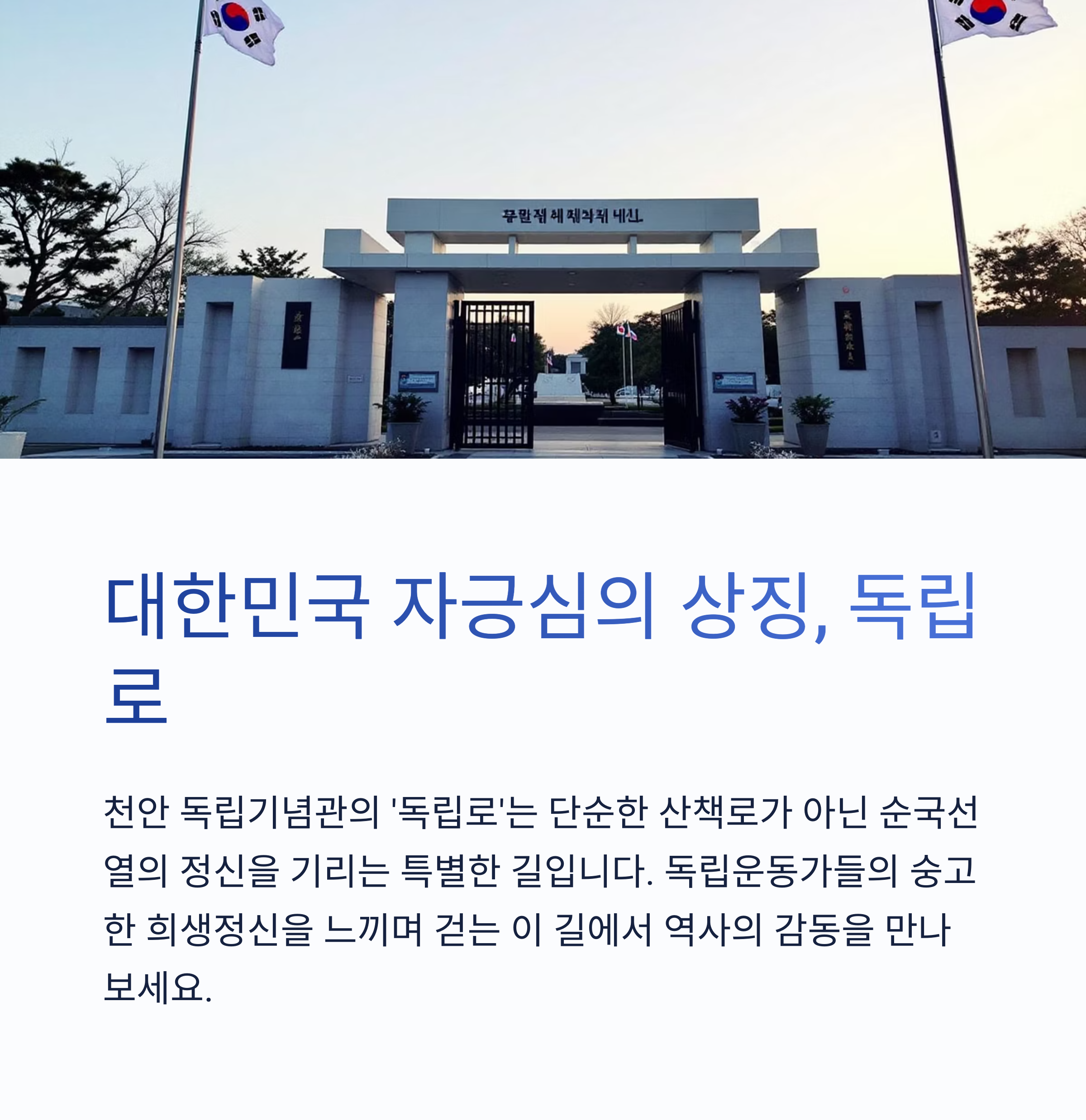 그 중심에 위치한 ‘독립로’는 단순한 산책로가 아닌, 순국선열의 정신을