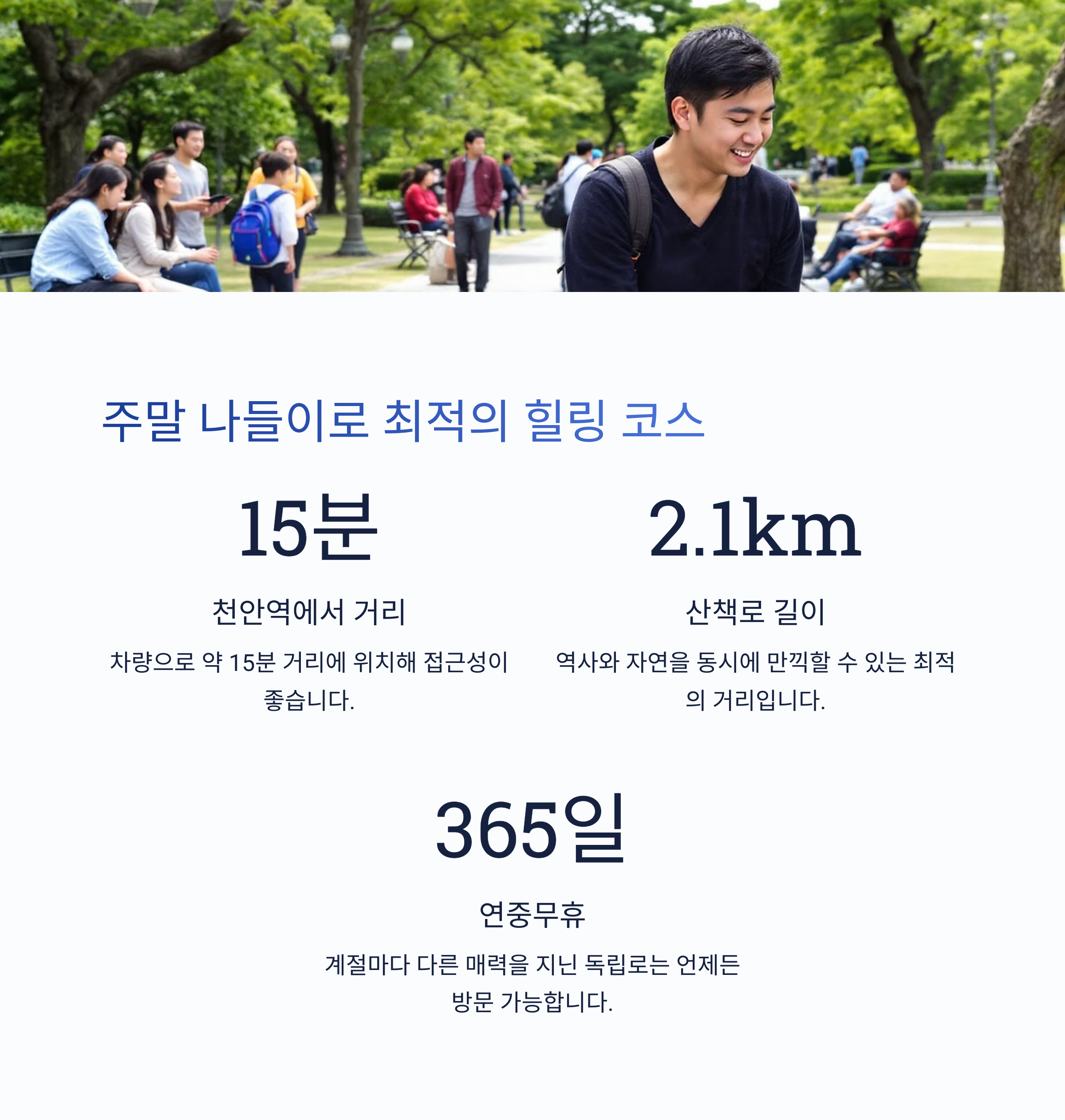 천안역에서 차량으로 약 15분 거리에 위치해 접근성도 좋고,