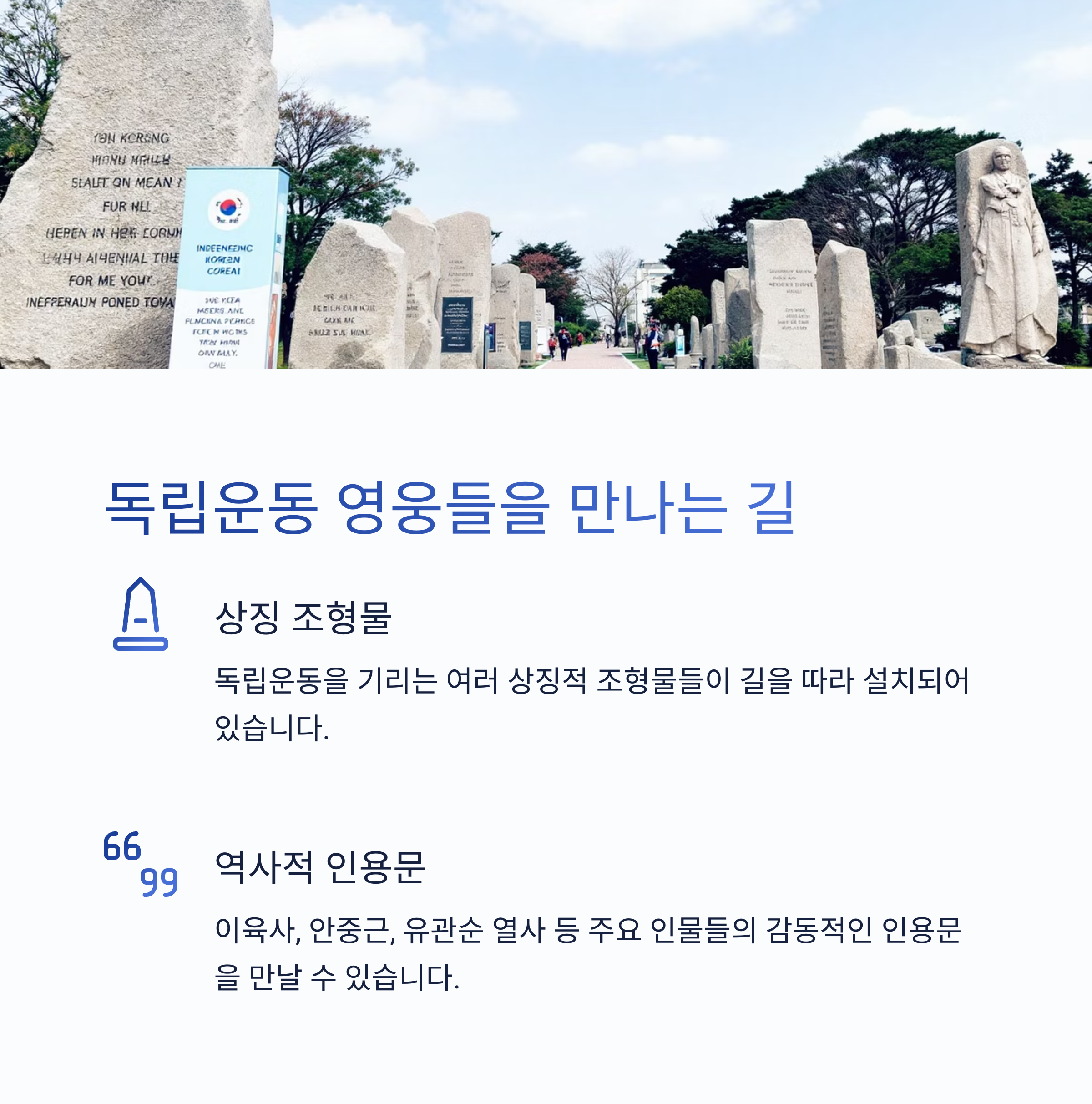 그 중심에 위치한 ‘독립로’는 단순한 산책로가 아닌, 순국선열의 정신을