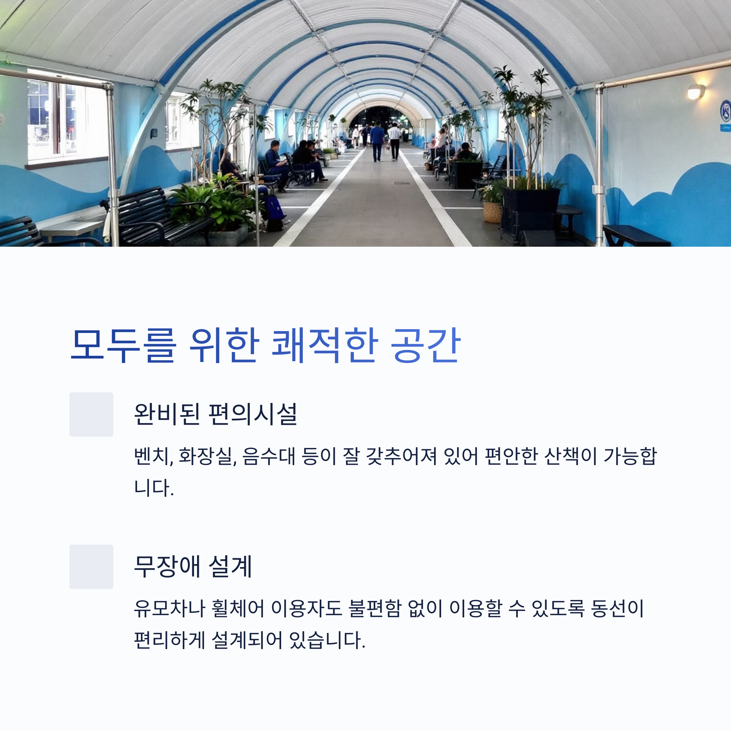 가볍게 산책하기에 불편함이 없습니다. 특히 유모차나 휠체어 이용자도
