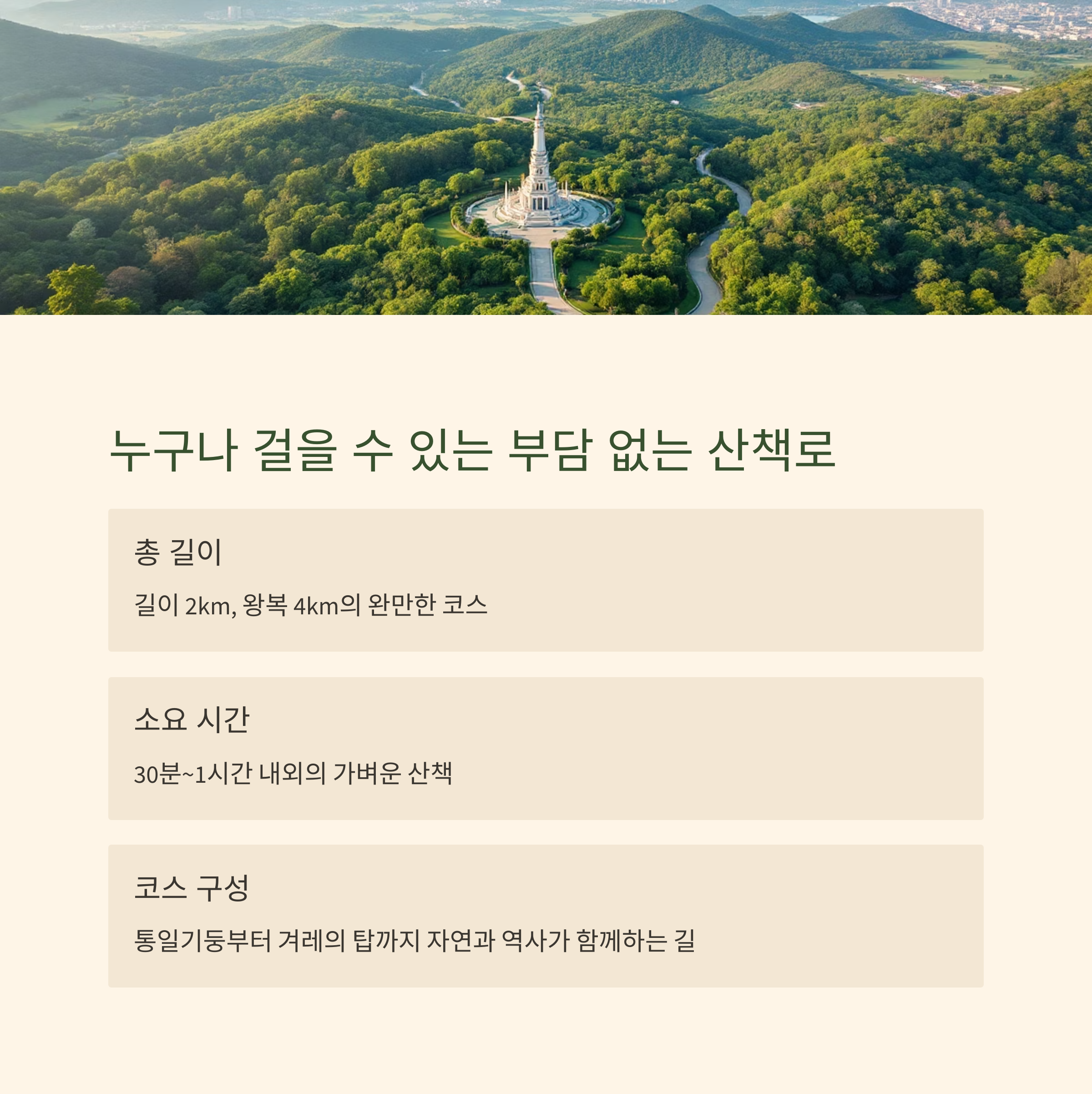 30분에서 1시간 정도 소요되어 가벼운 산책이나 가정 나들이 코스로 적합합니다.