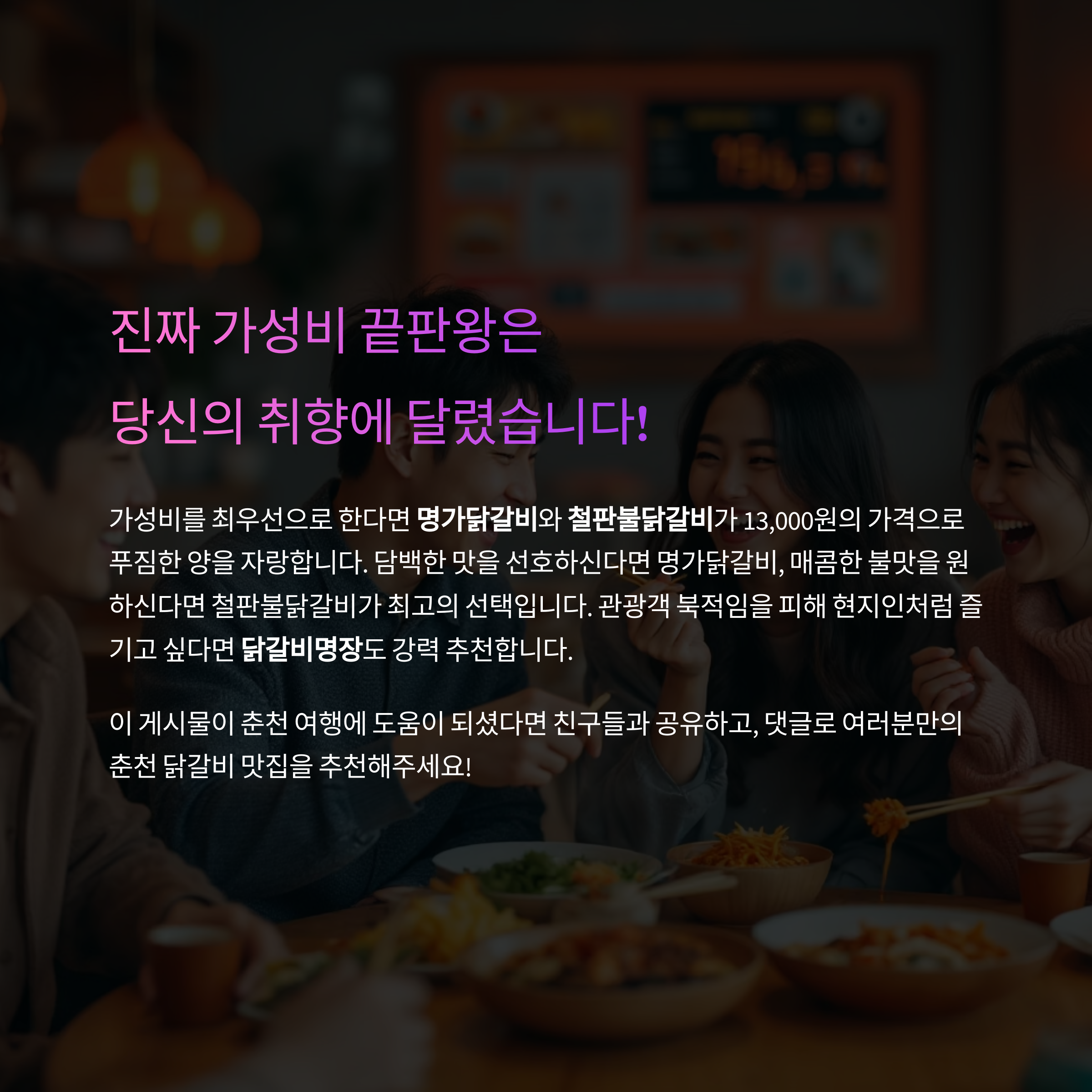 가성비를 따진다면 "명가닭갈비"와 "철판불닭갈비"가 최고의 선택지입니다.