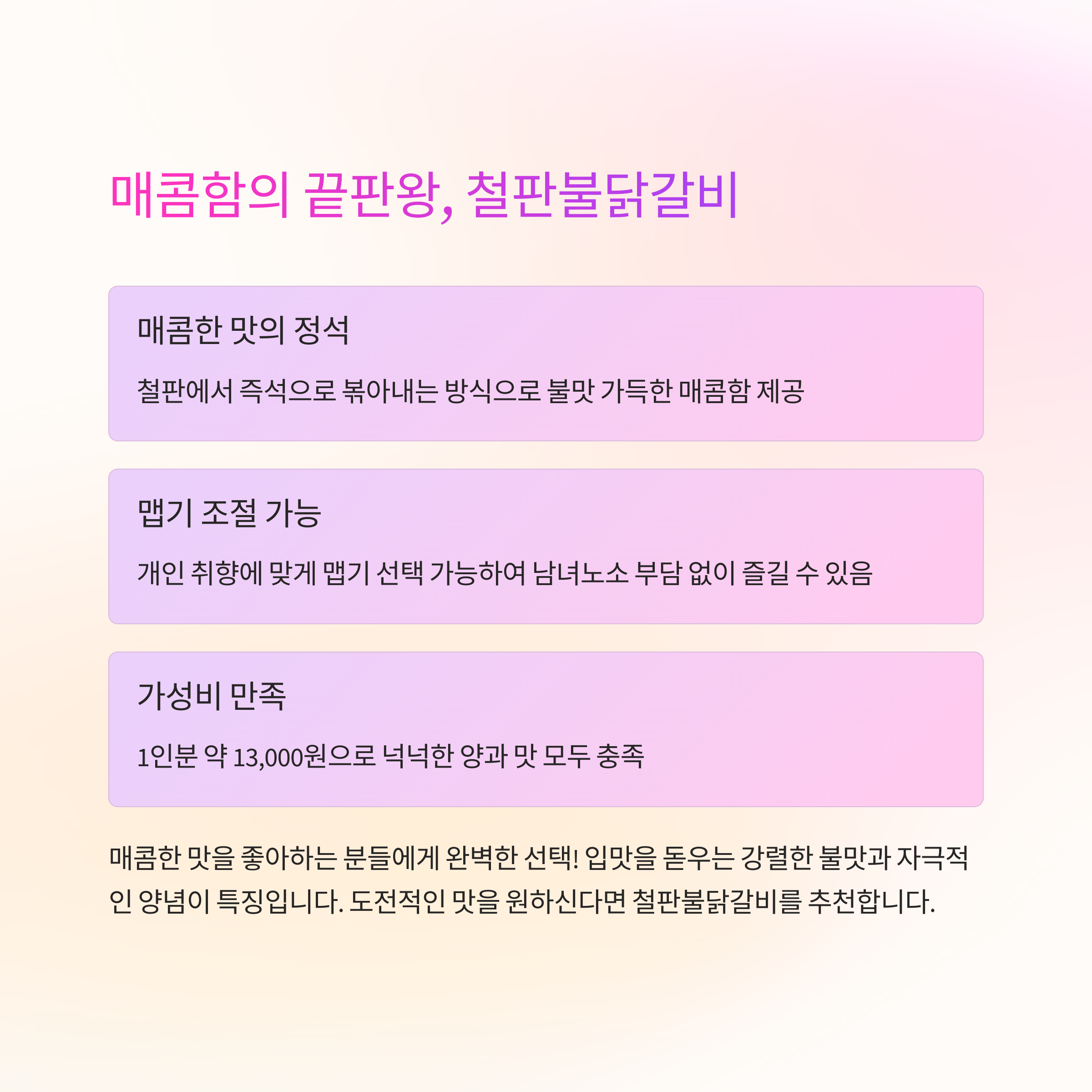 | 철판불닭갈비 | 13,000원 | 넉넉 | 매콤 불맛 | 캐주얼 |