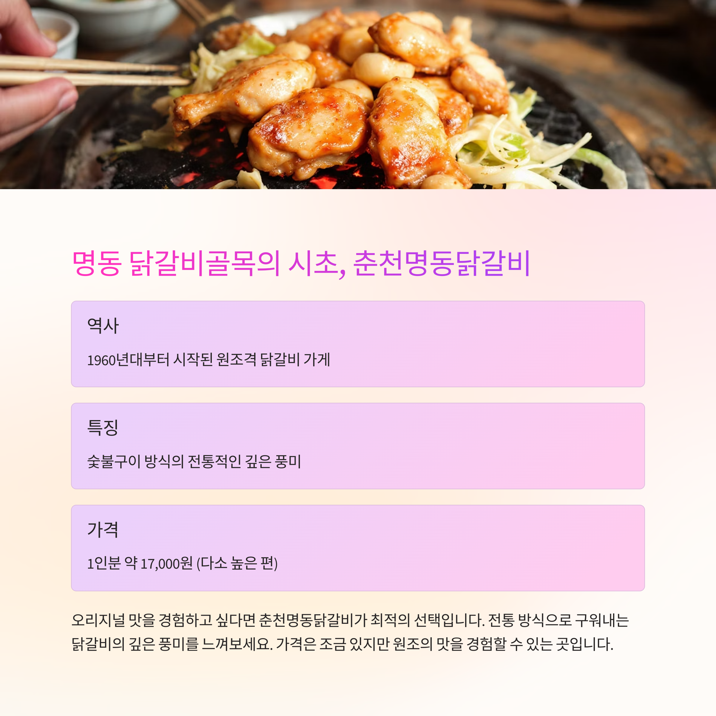 | 춘천명동닭갈비 | 17,000원 | 보통 | 전통 숯불 | 클래식 |