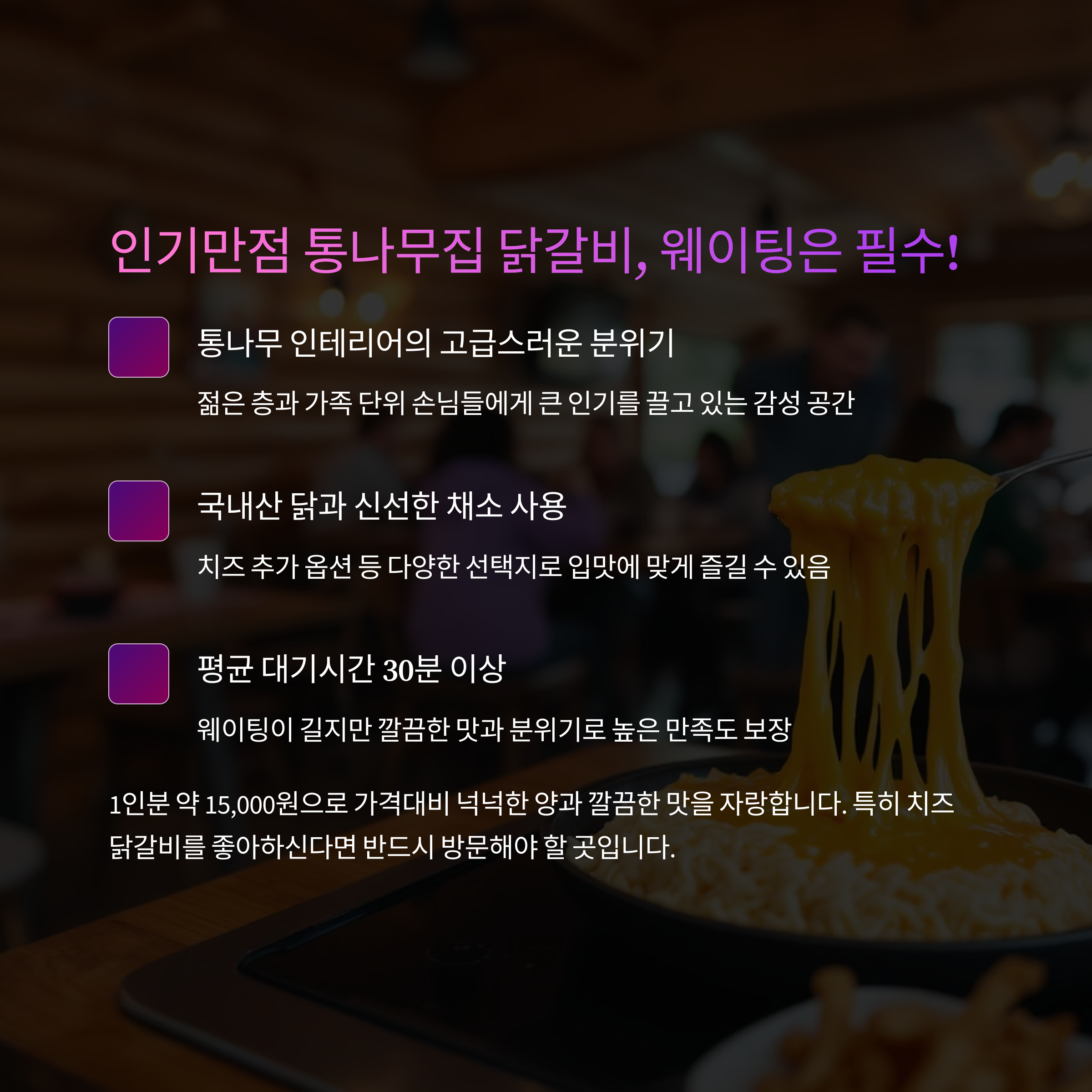 | 통나무집 닭갈비 | 15,000원 | 넉넉 | 깔끔, 치즈 | 감성 인테리어 |