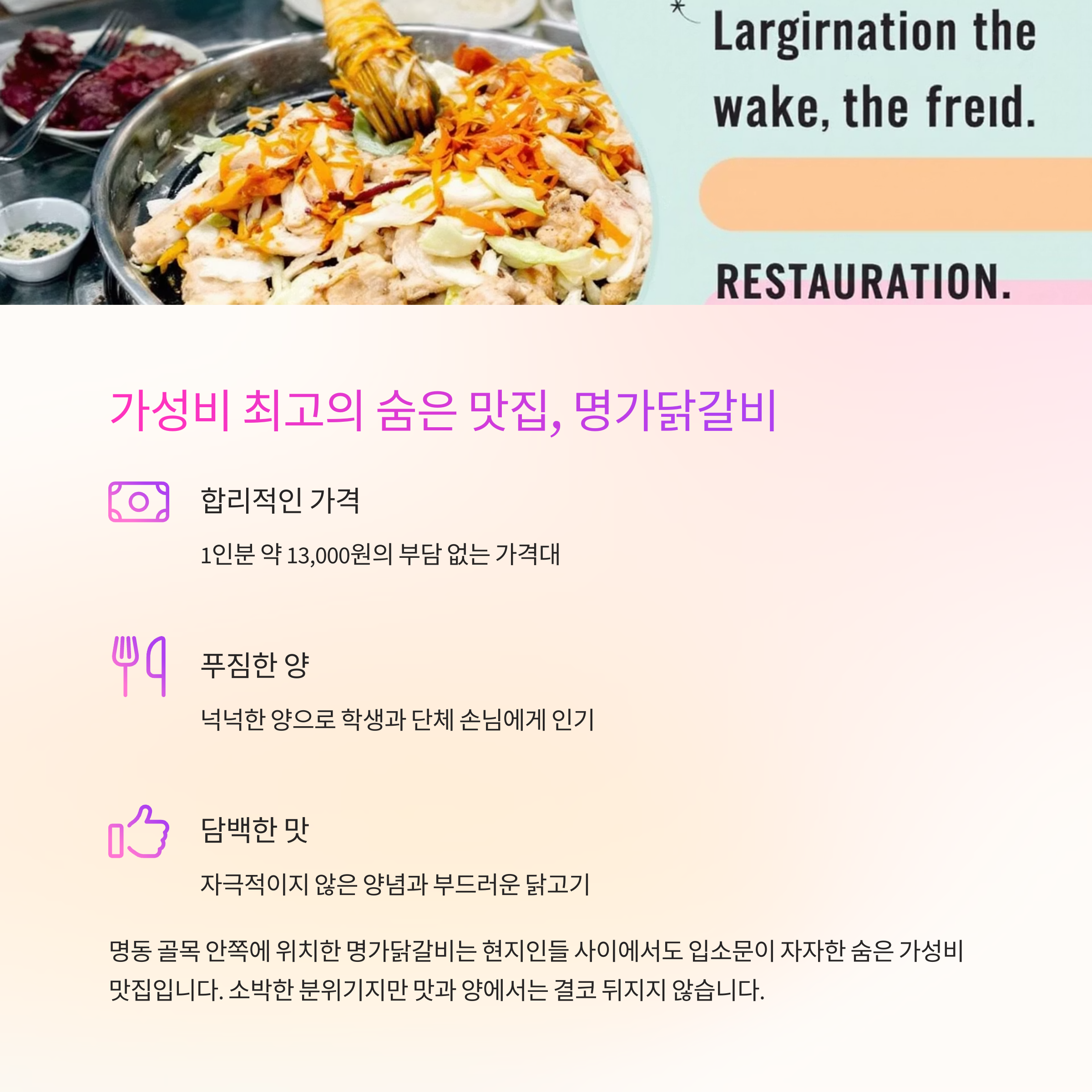 | 명가닭갈비 | 13,000원 | 푸짐 | 담백 | 소박 |