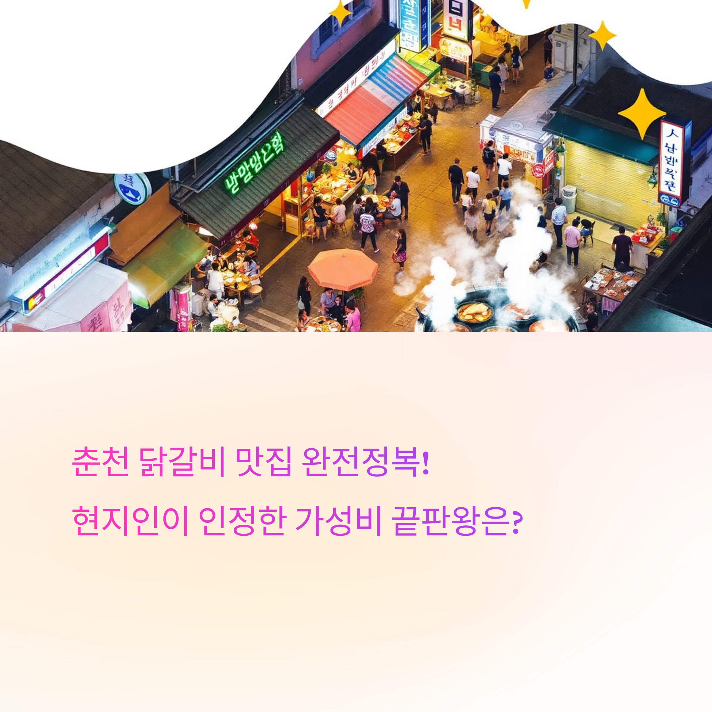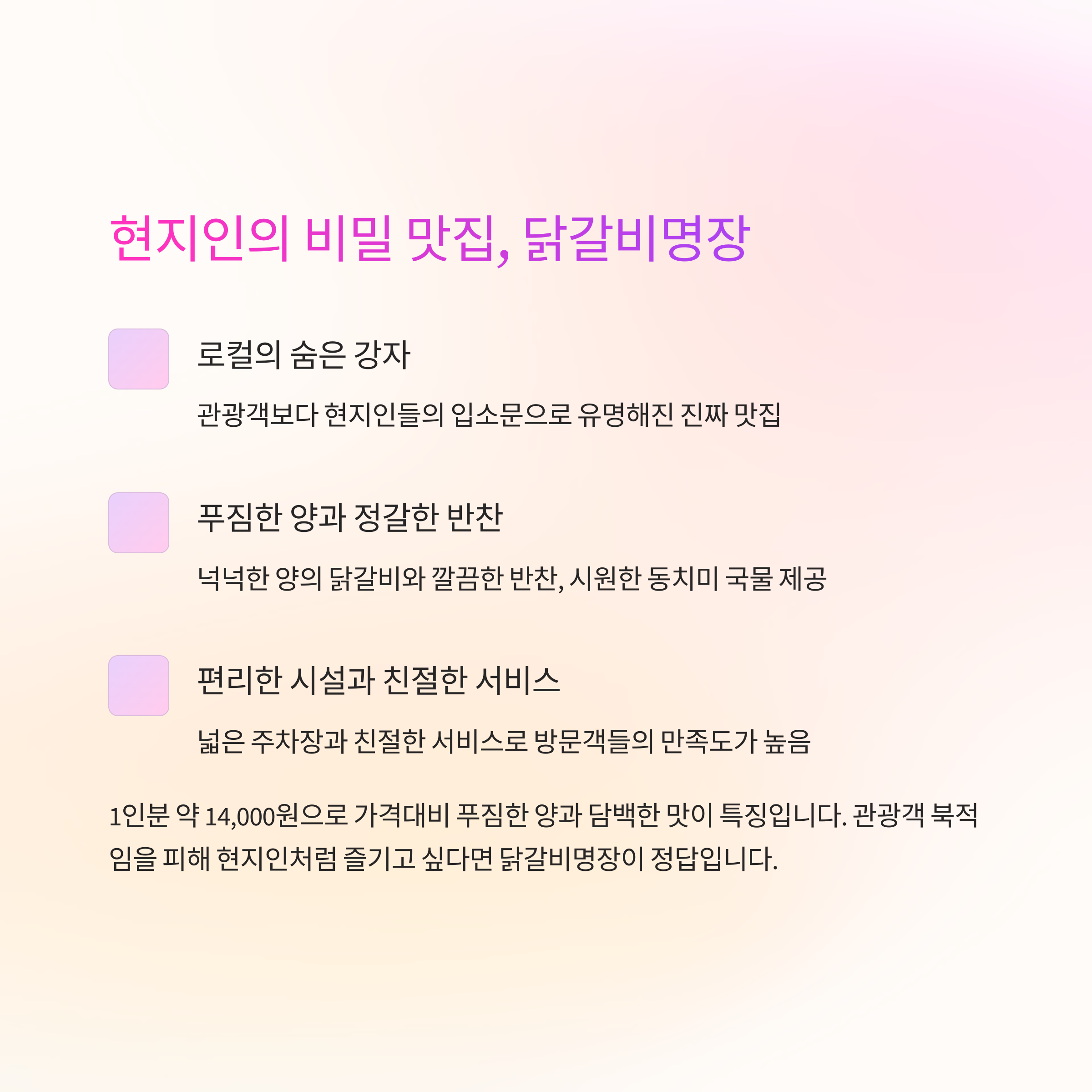 관광객 북적임을 피해 현지인 분위기를 느끼고 싶다면 "닭갈비명장"도 강력 추천입니다.