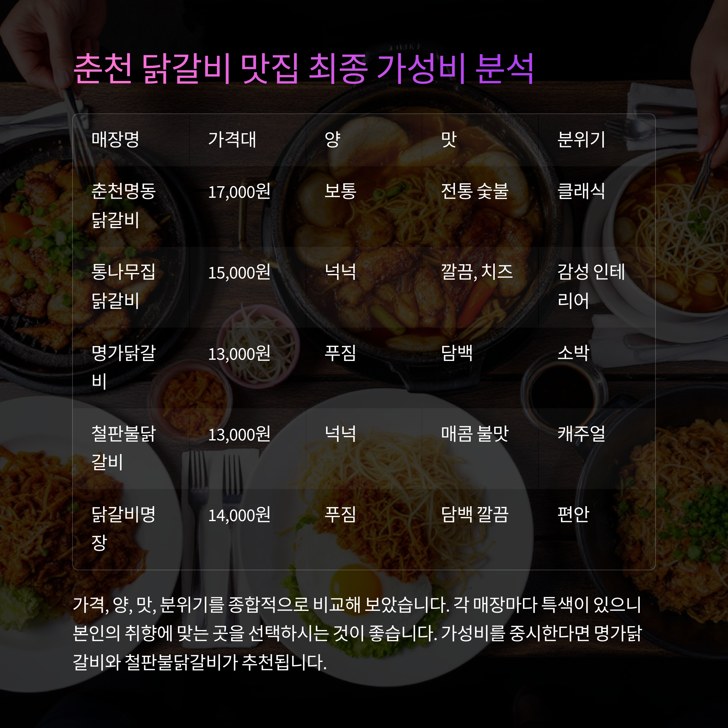 가성비를 따진다면 "명가닭갈비"와 "철판불닭갈비"가 최고의 선택지입니다.