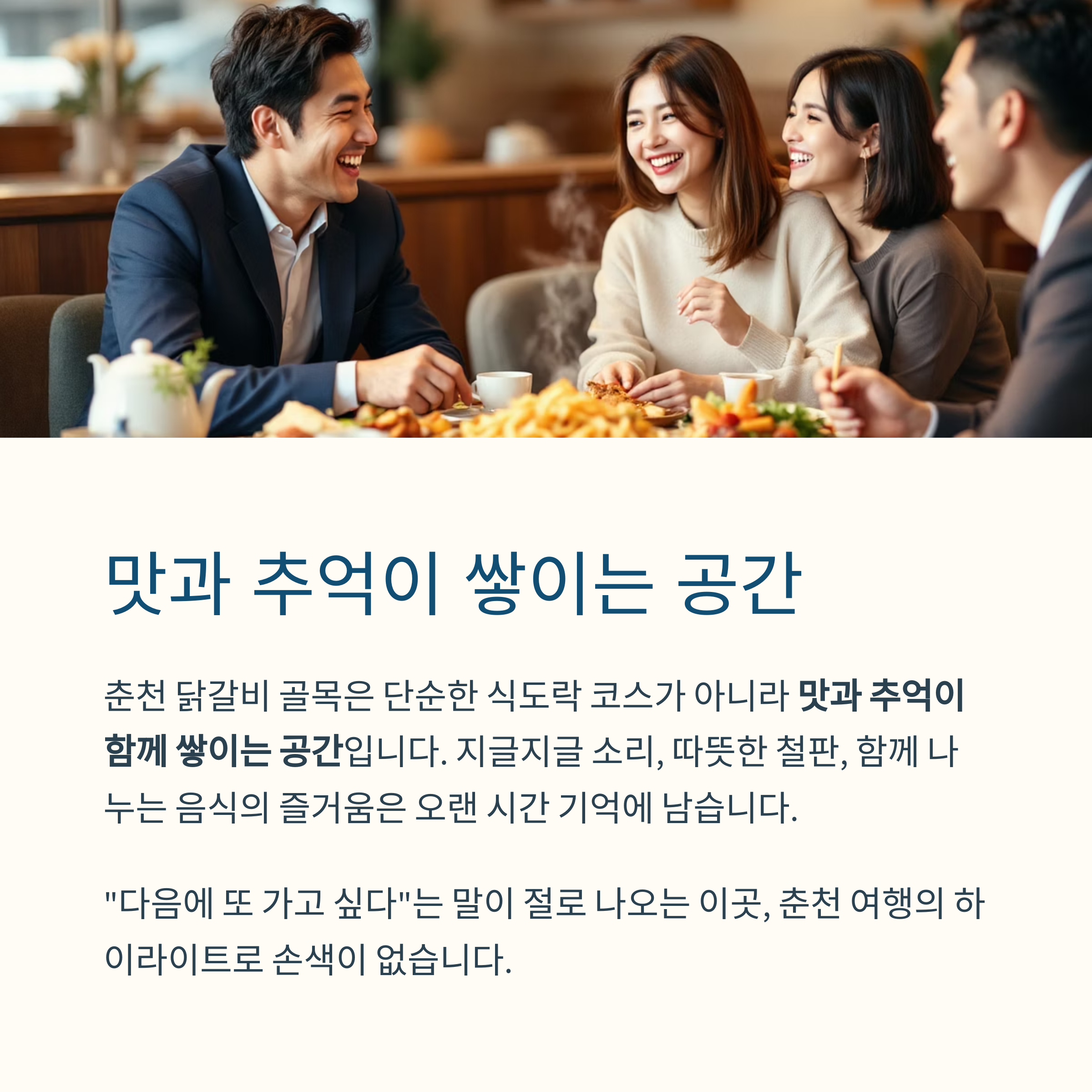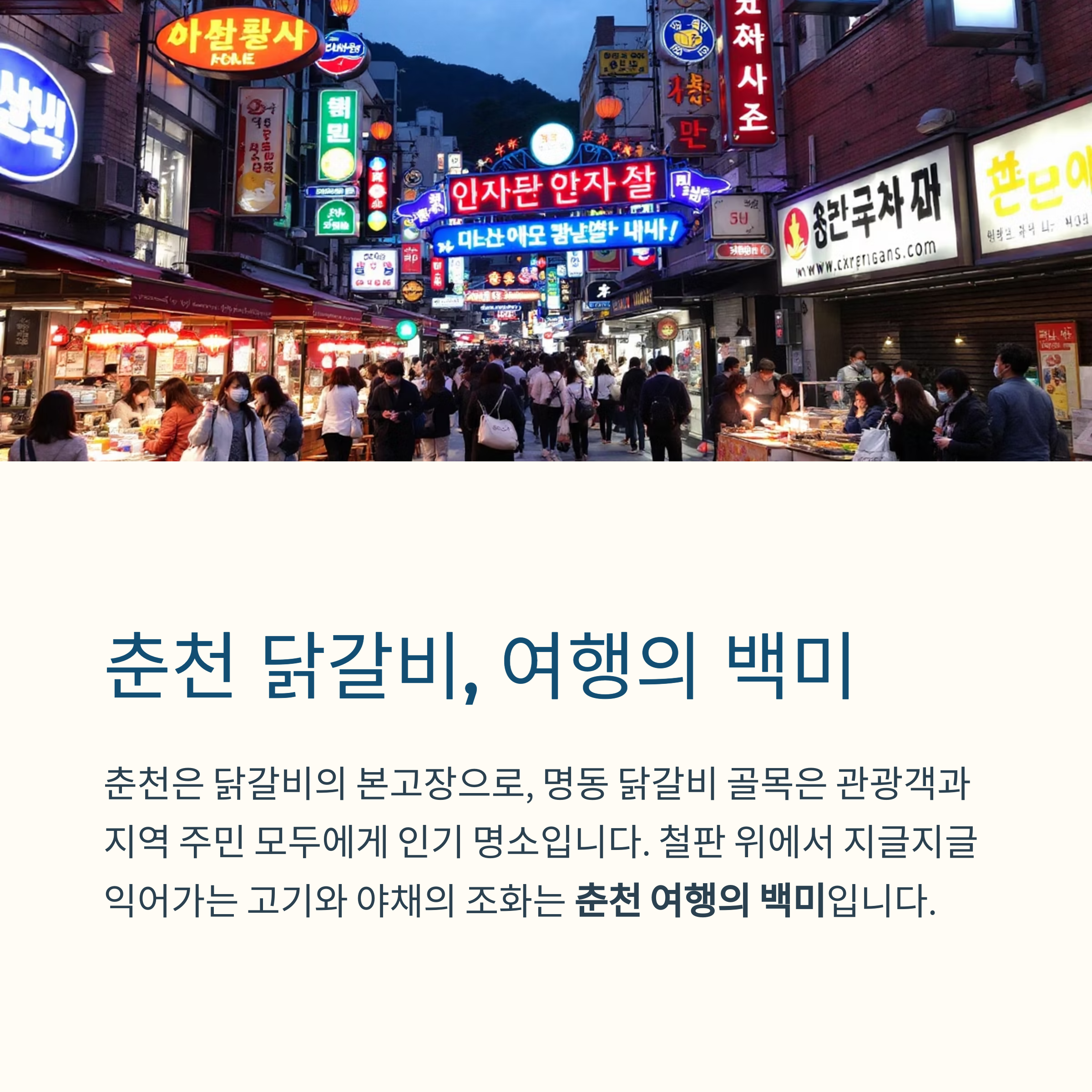춘천 닭갈비 골목은 단순한 식도락 코스가 아니라 맛과 추억이 함께 쌓이는 공간입니다.