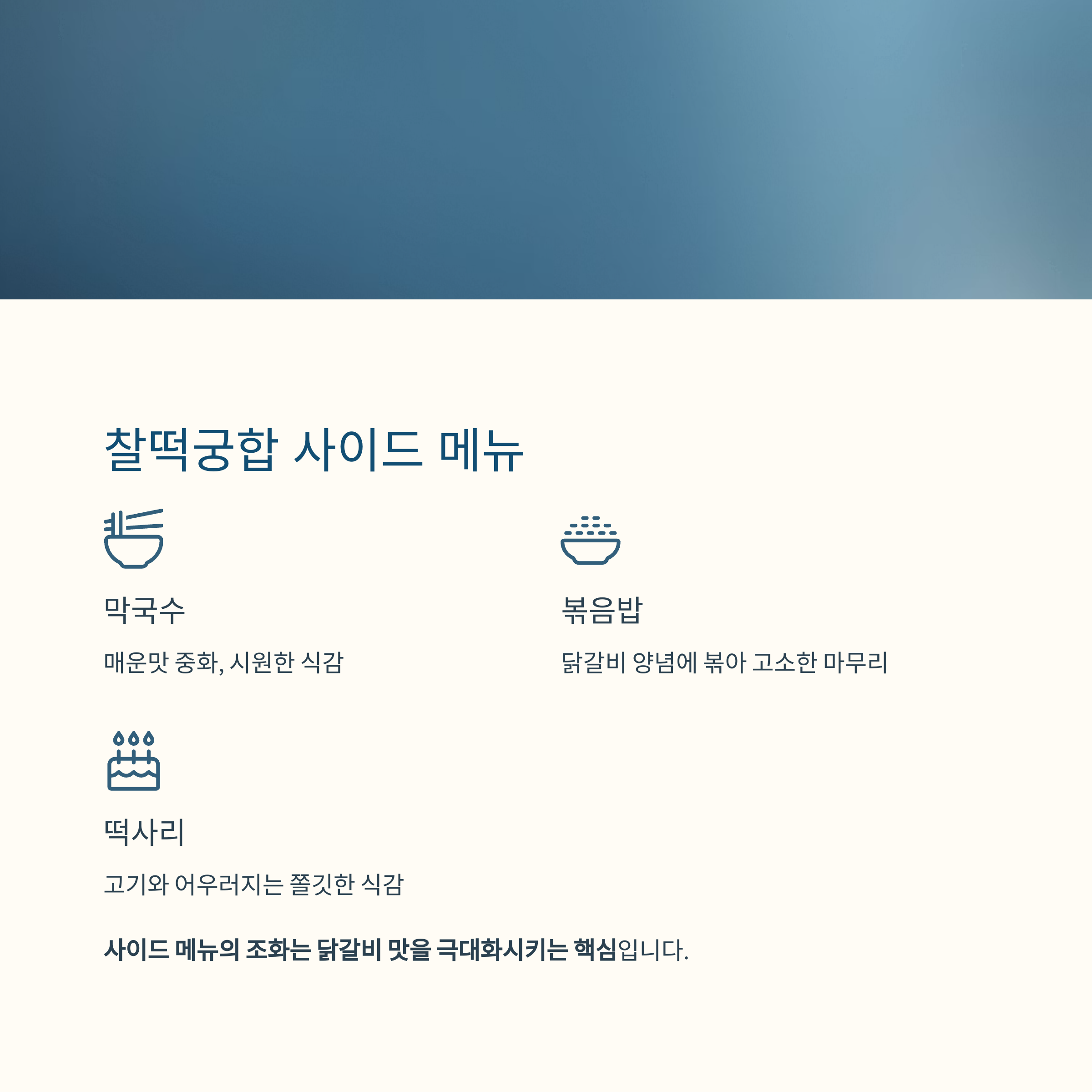 사이드 메뉴의 조화는 닭갈비 맛을 극대화시키는 핵심 포인트입니다.