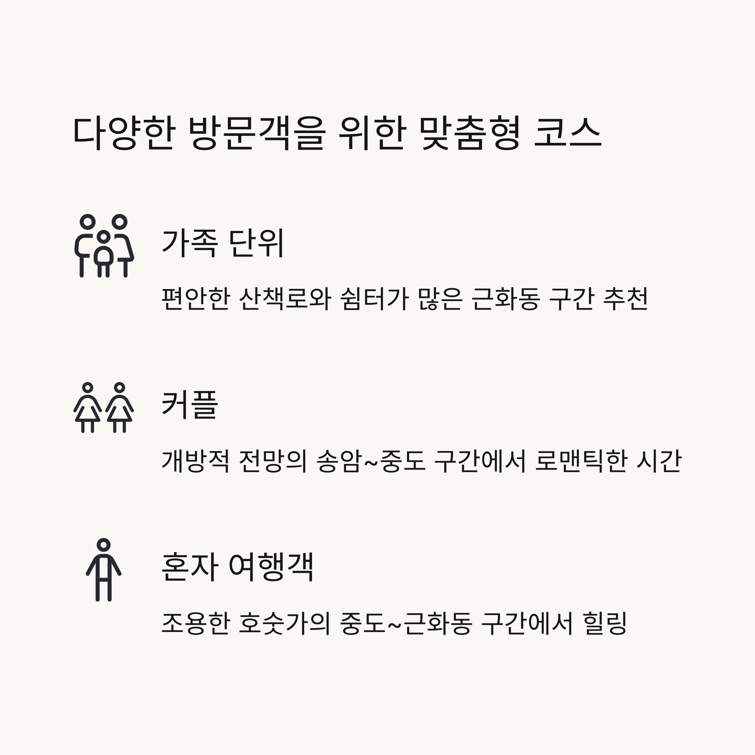 편안한 워킹 코스와 도심 접근성 덕분에 가족 단위 방문객, 커플, 혼자 여행객 모두에게 인기가 높습니다.