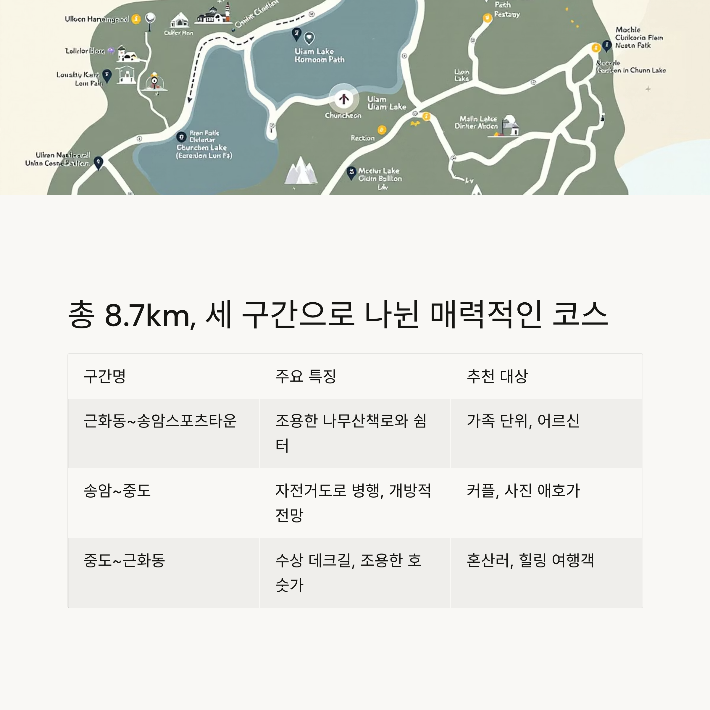 | 중도~근화동 | 수상 데크길, 조용한 호숫가 | 혼산러, 힐링 여행객 |