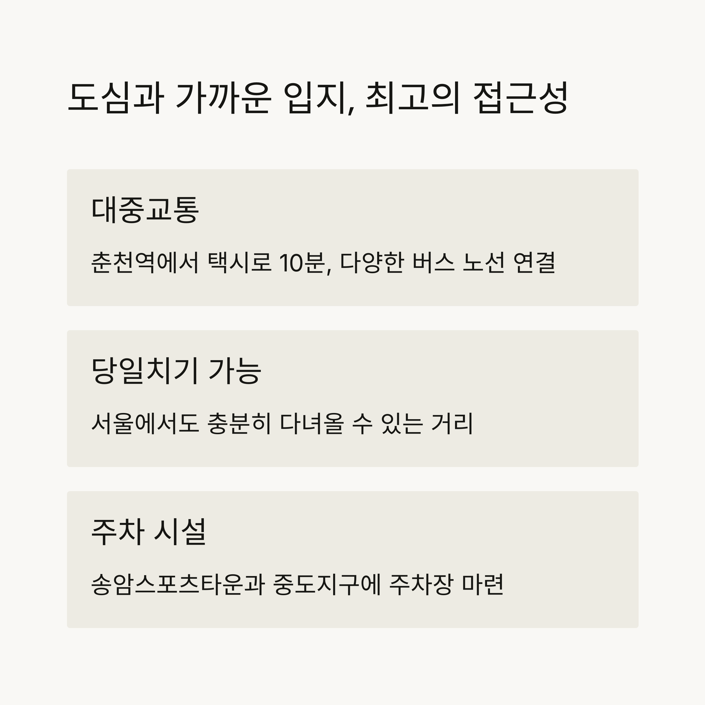 춘천역에서 택시로 10분, 버스 노선도 다양하게 연결되어 있어