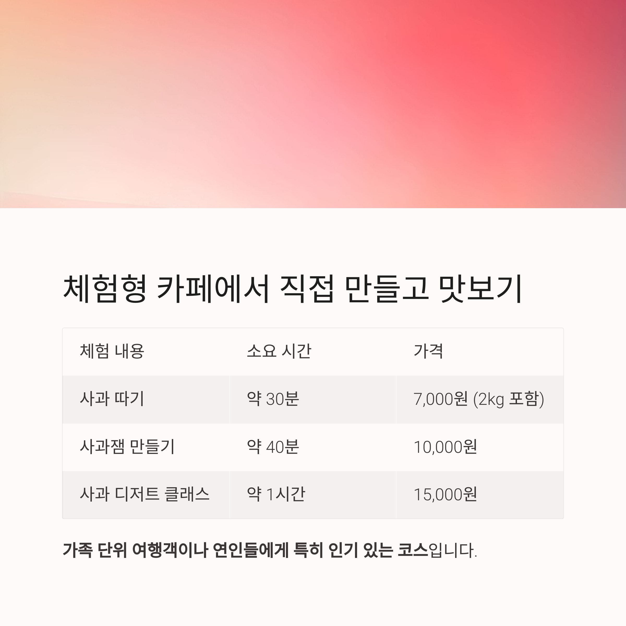 비 오는 날은 일부 체험이 제한되므로 확인 필수입니다. - 사과 디저트는 현장 구매 외에도