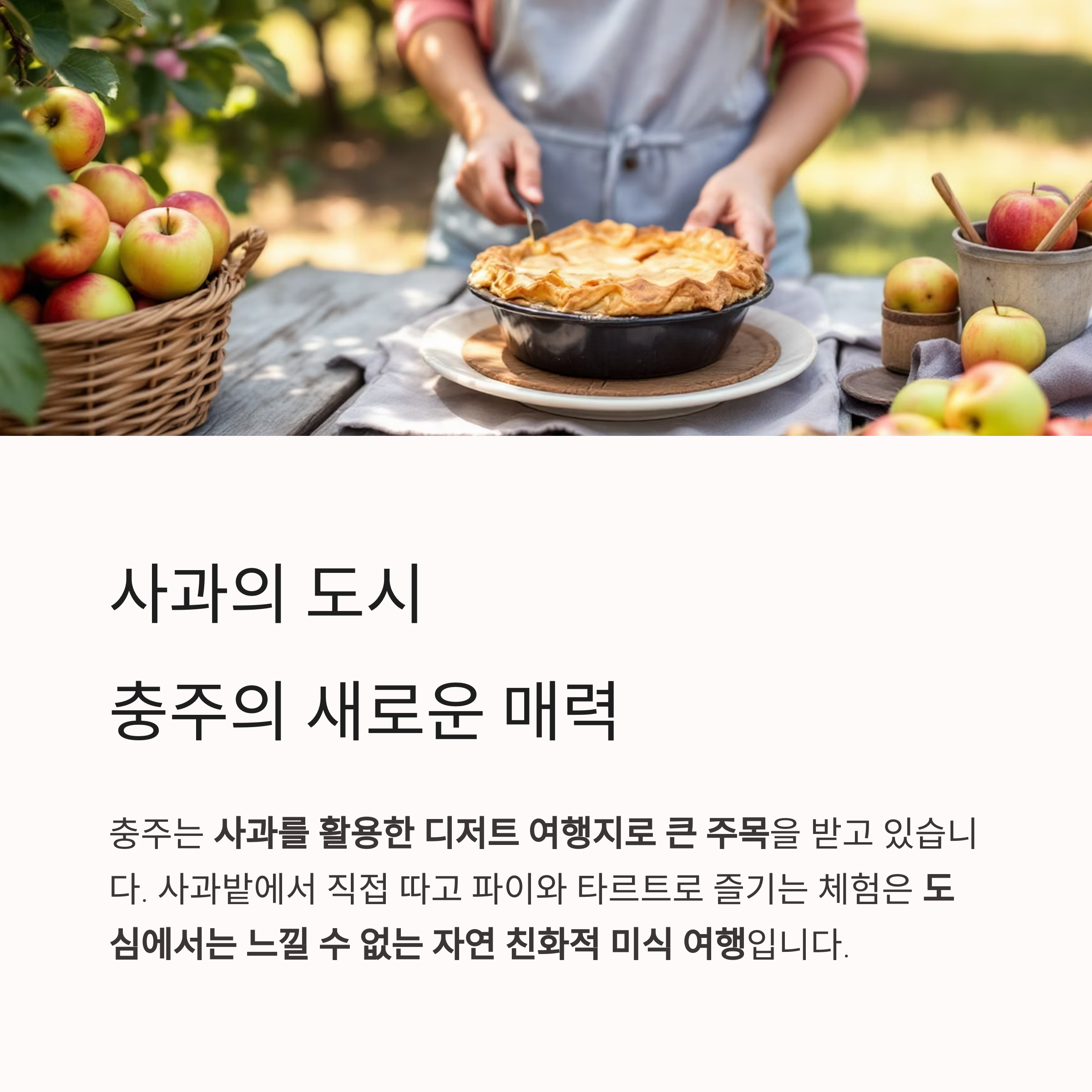충주는 사과의 도시로 유명하지만, 최근에는 사과를 활용한 디저트 여행지로도 큰 주목을 받고 있습니다.