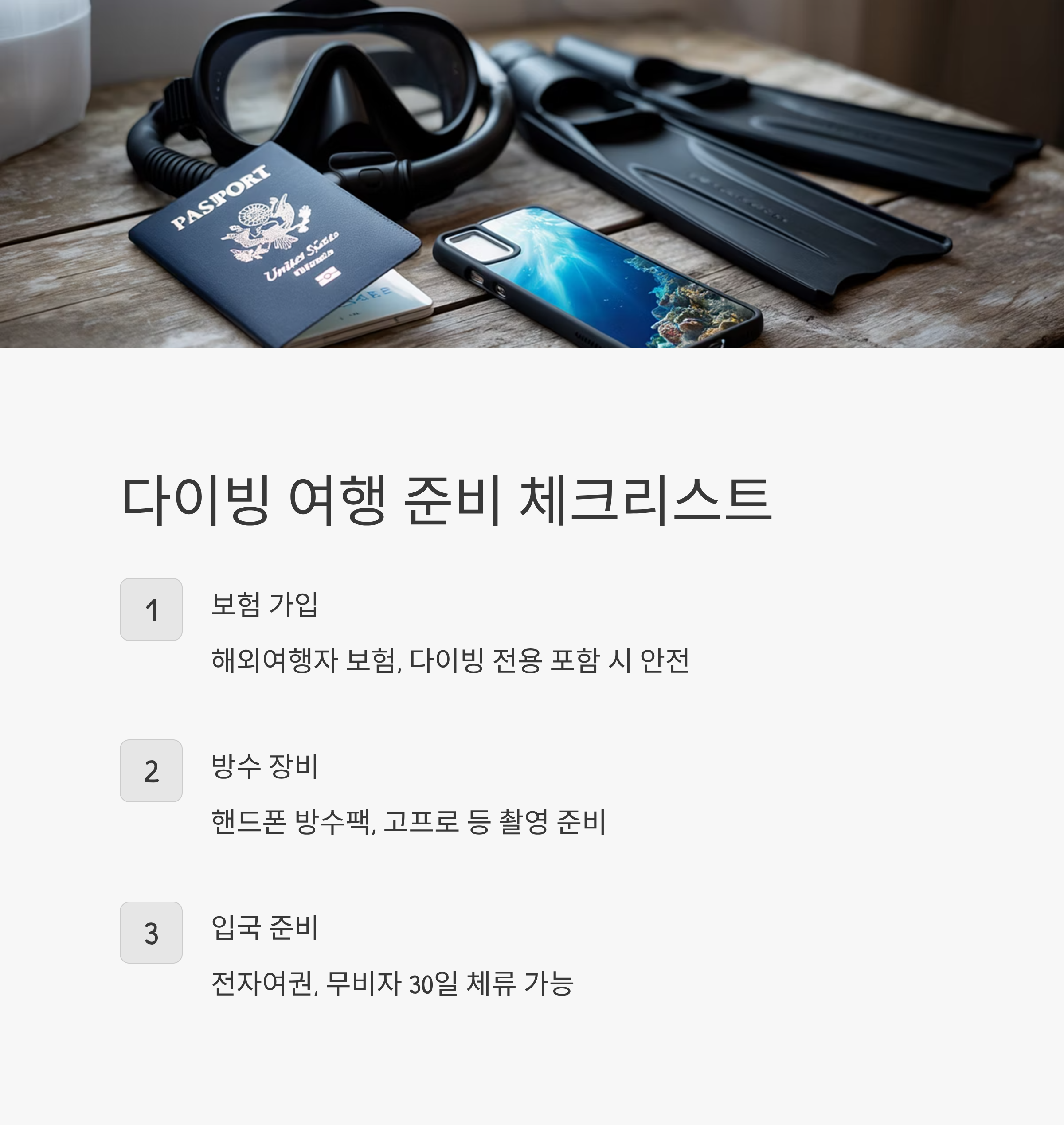 | 보험 가입 | 해외여행자 보험, 다이빙 전용 포함 시 안전 |
