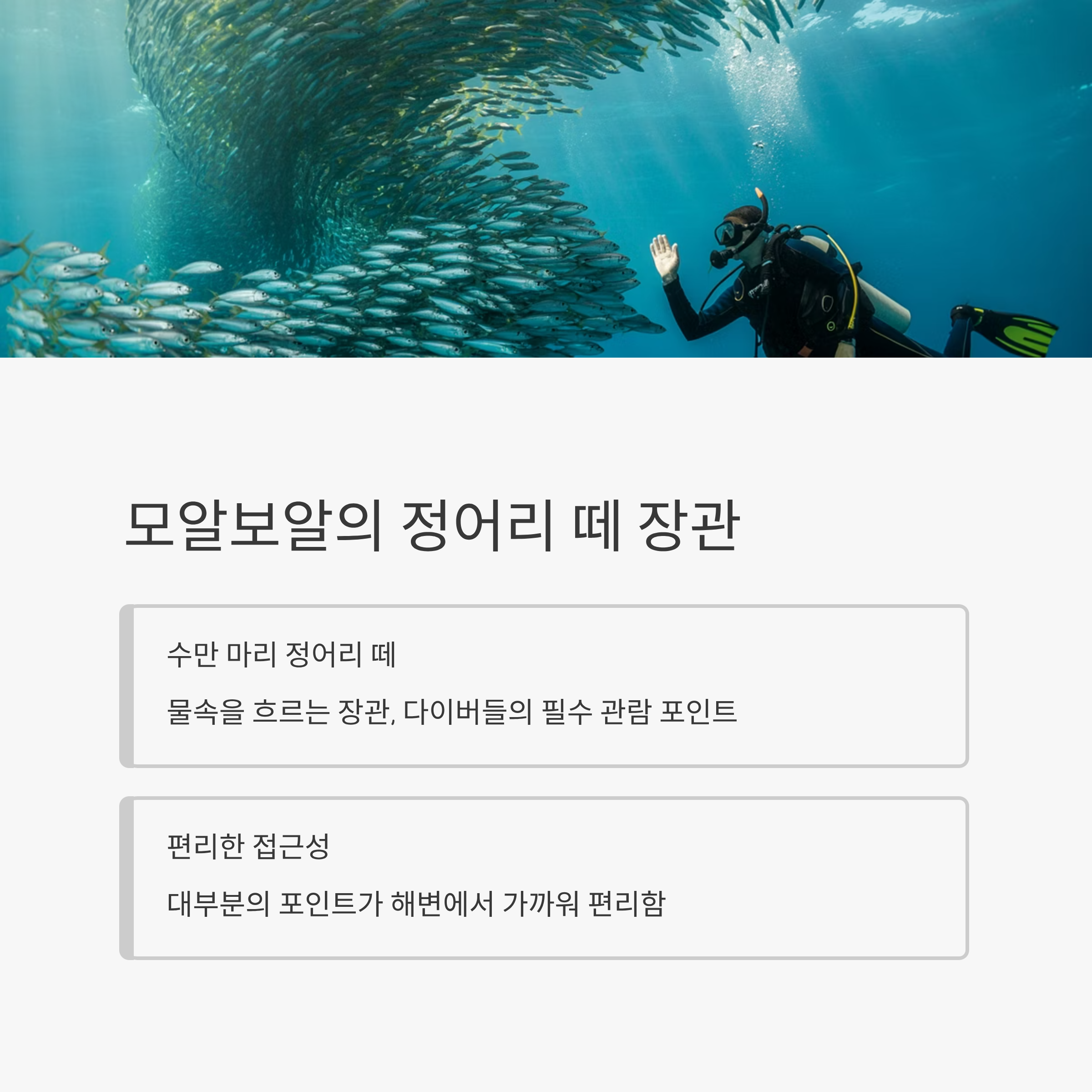 정어리 떼가 물속을 흐르는 장관은 다이버들 사이에서 유명한 필수 관람 포인트입니다.
