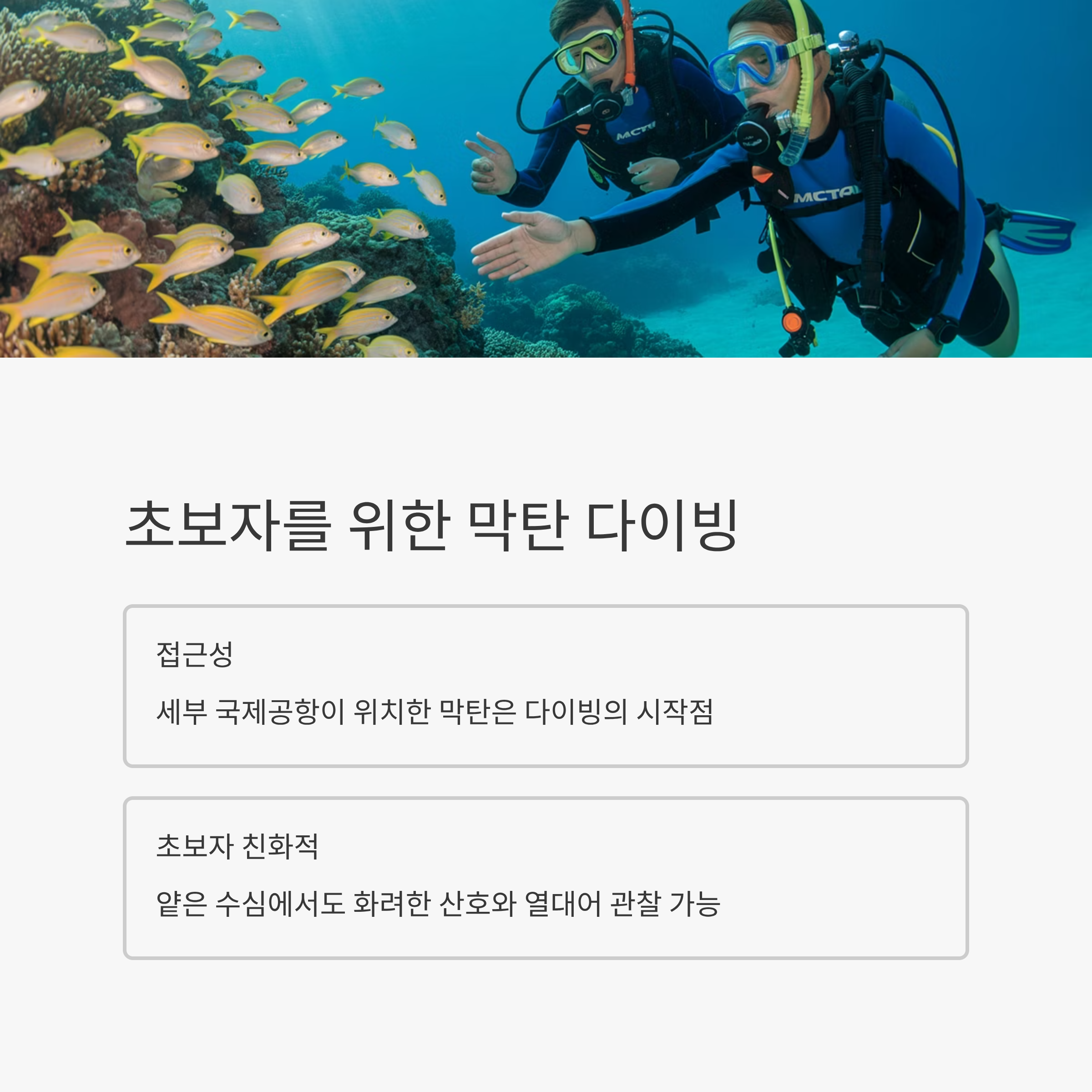 | 막탄 해안 | 체험 다이빙, 접근성 용이 |