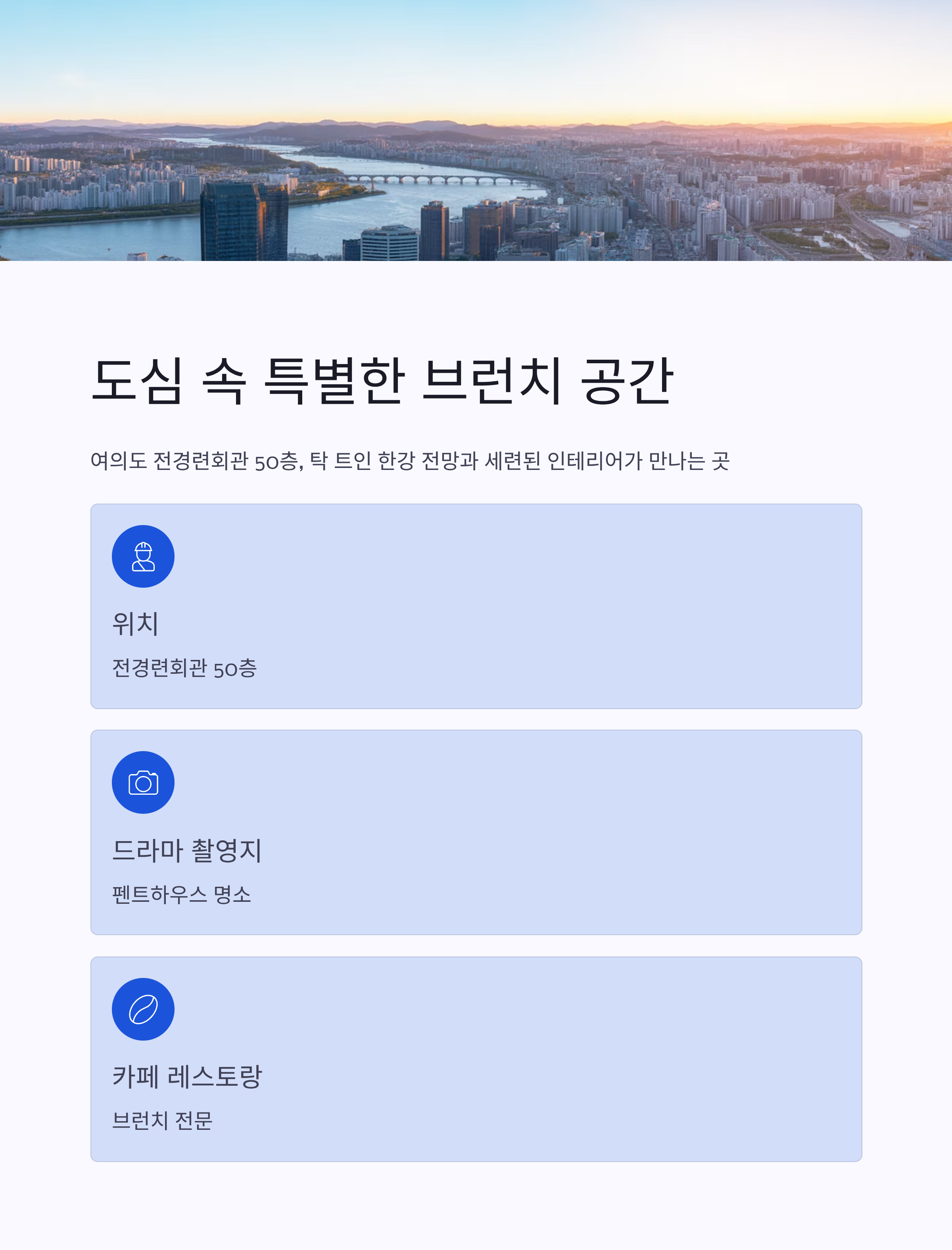 여의도 전경련회관 50층에 위치한 이곳은 탁 트인 한강 전망과 세련된 인테리어, 섬세한 브런치 메뉴로 인기를 끌고 있는 카페 레스토랑입니다.