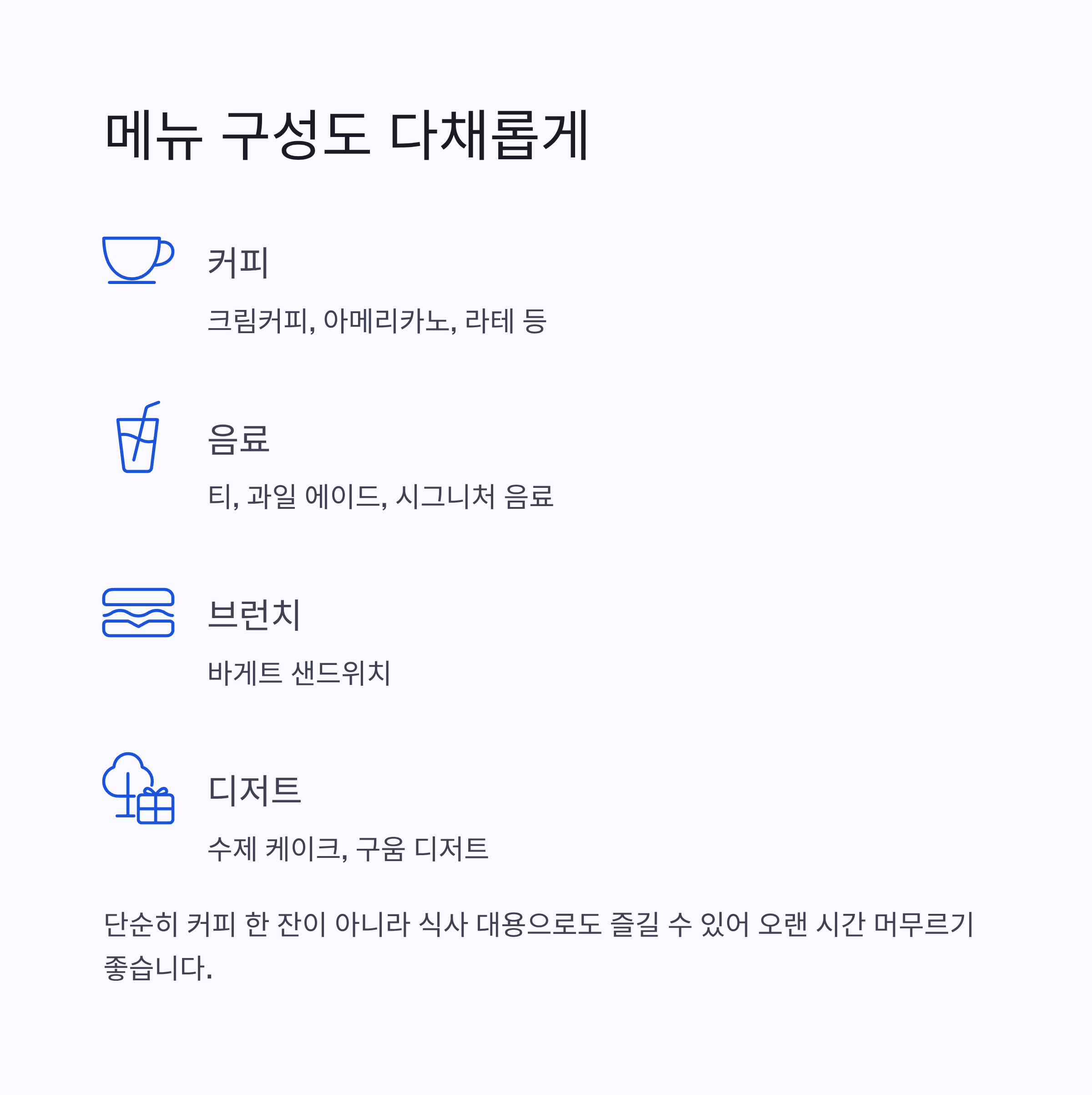 | 음료 | 티, 과일 에이드, 시그니처 음료 |