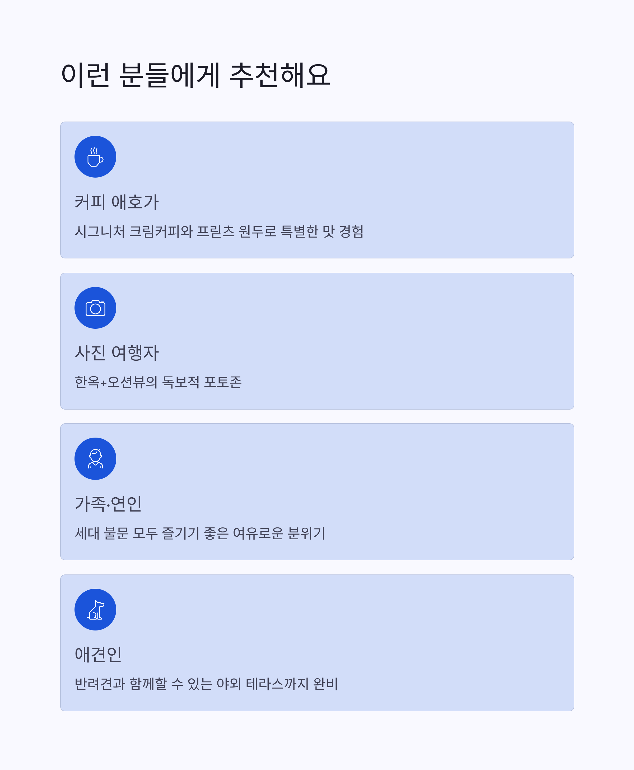 | 애견인 | 반려견과 함께할 수 있는 야외 테라스까지 완비 |