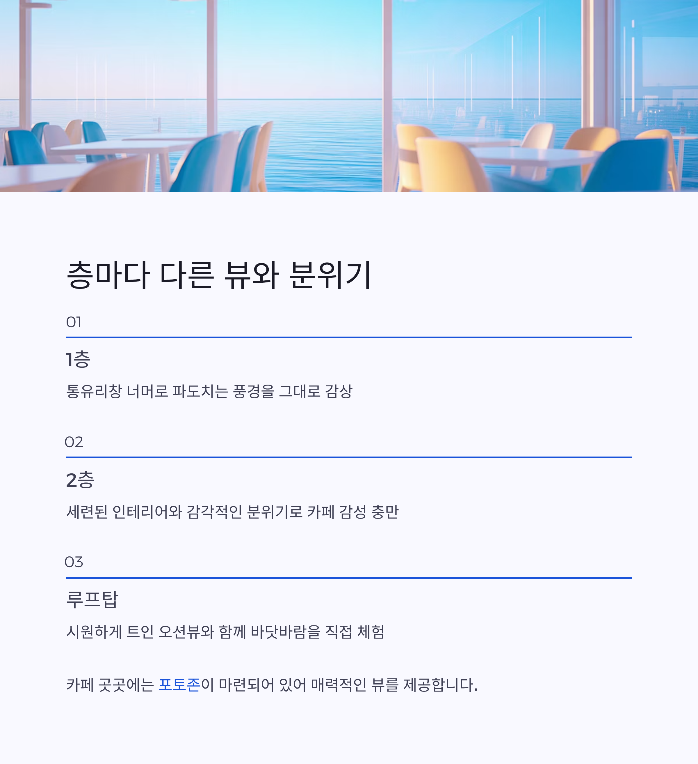 | 루프탑 | 시원하게 트인 오션뷰와 함께 바닷바람을 직접 느낄 수 있는 공간 |