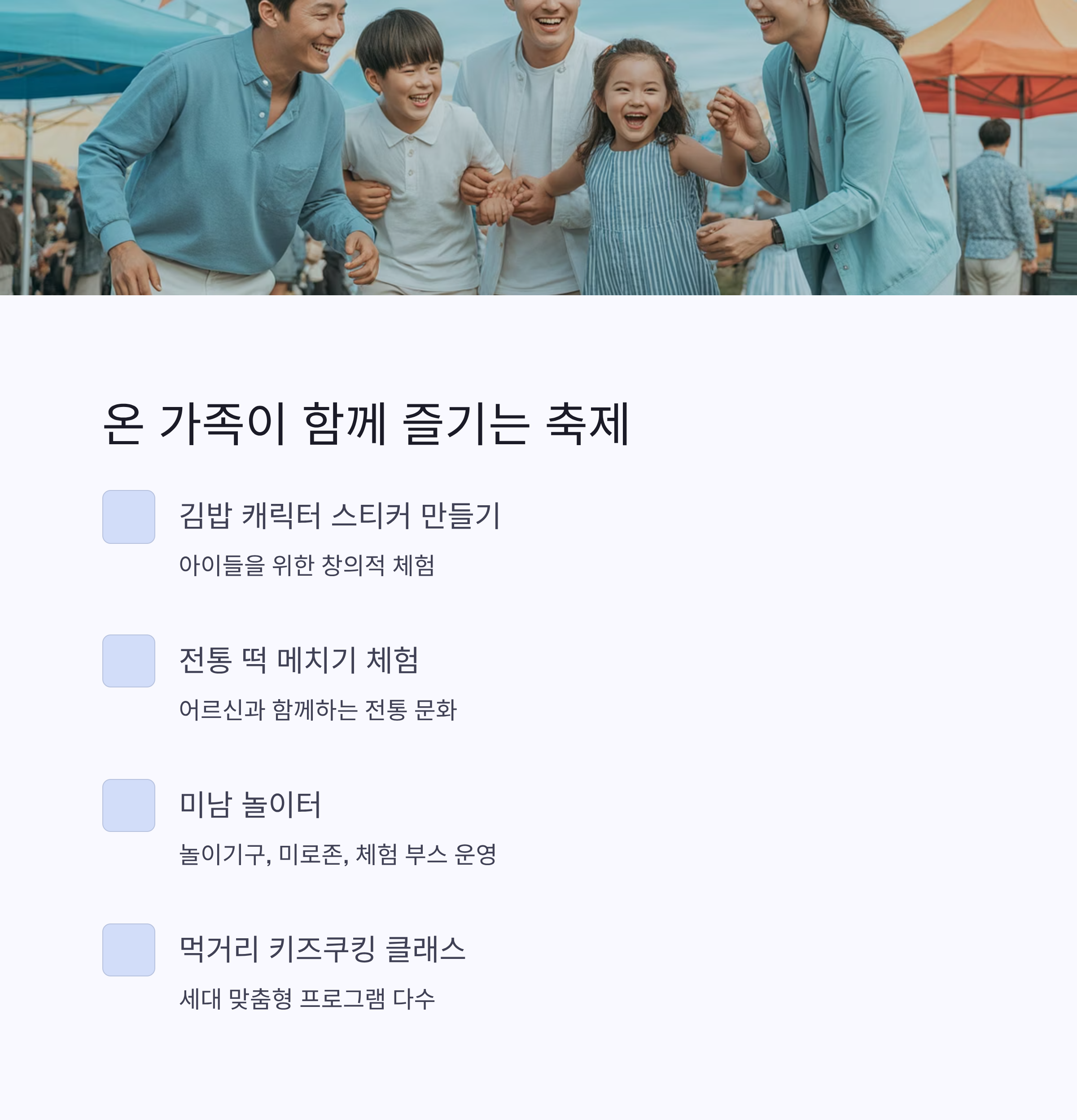 다채로운 먹거리 체험과 가족 중심의 프로그램을 구성해
