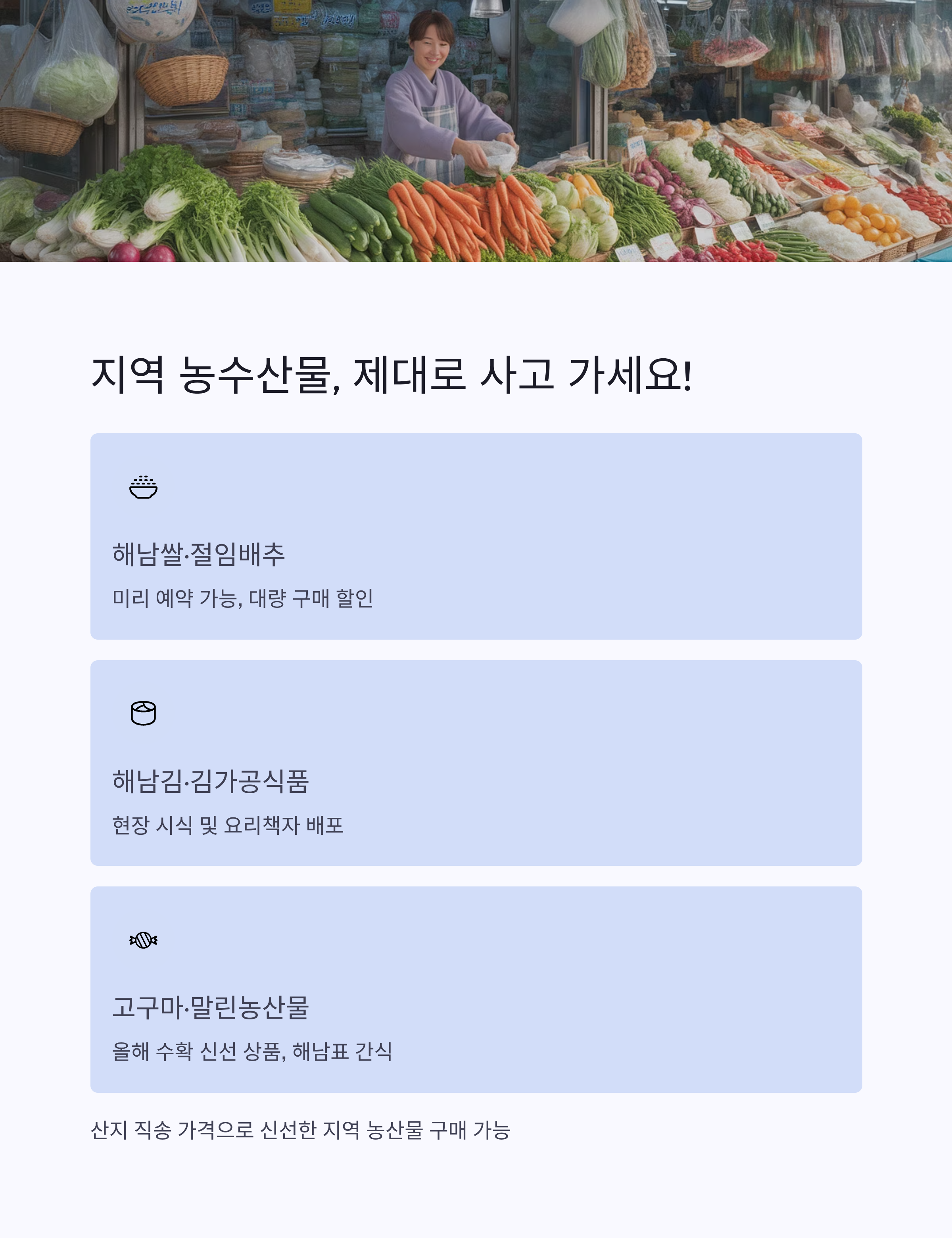 | 해남쌀, 절임배추 | 미리 예약도 가능, 대량 구매 고객 할인 적용 |