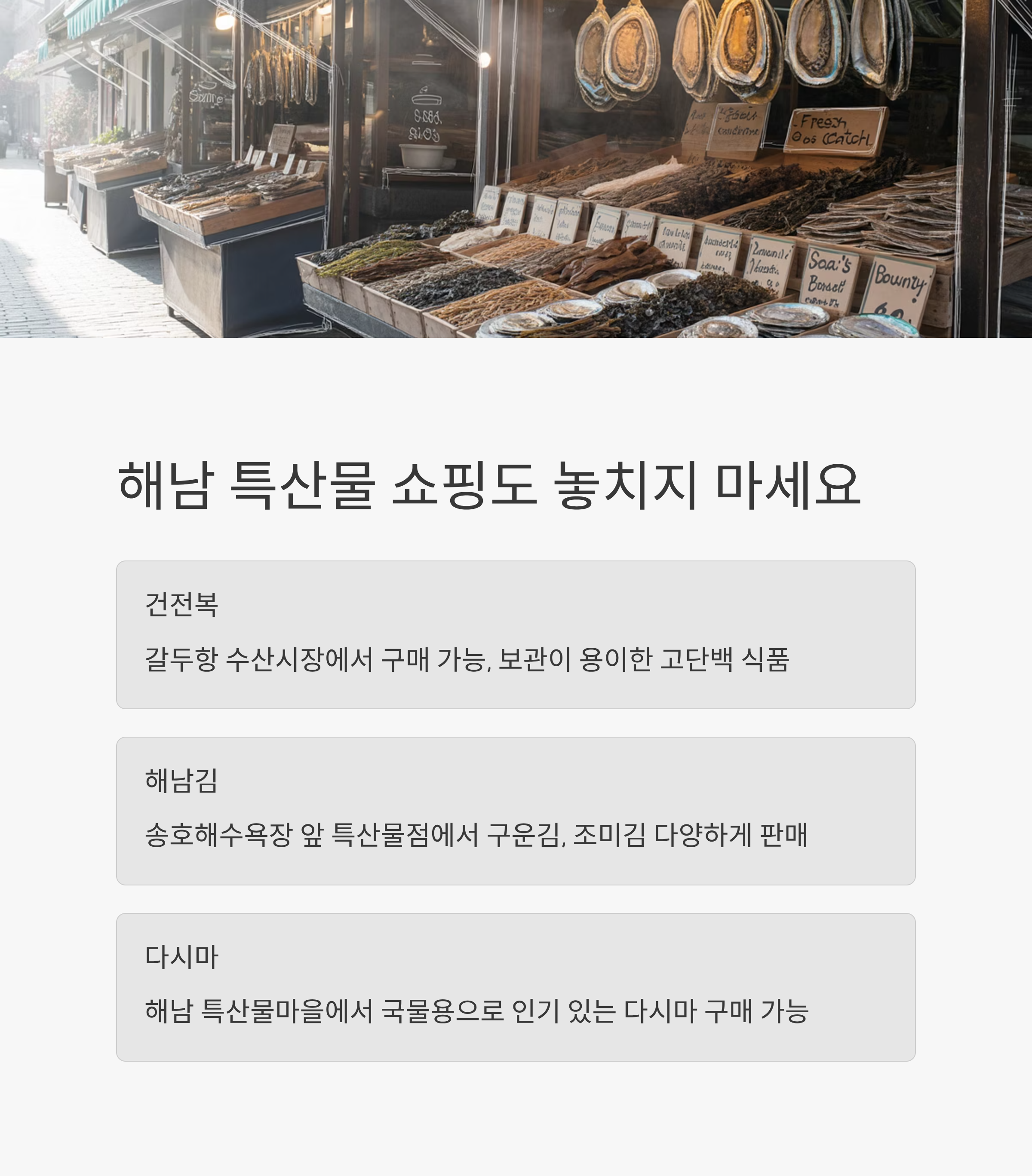 | 건전복 | 갈두항 수산시장 | 보관 용이, 고단백 |