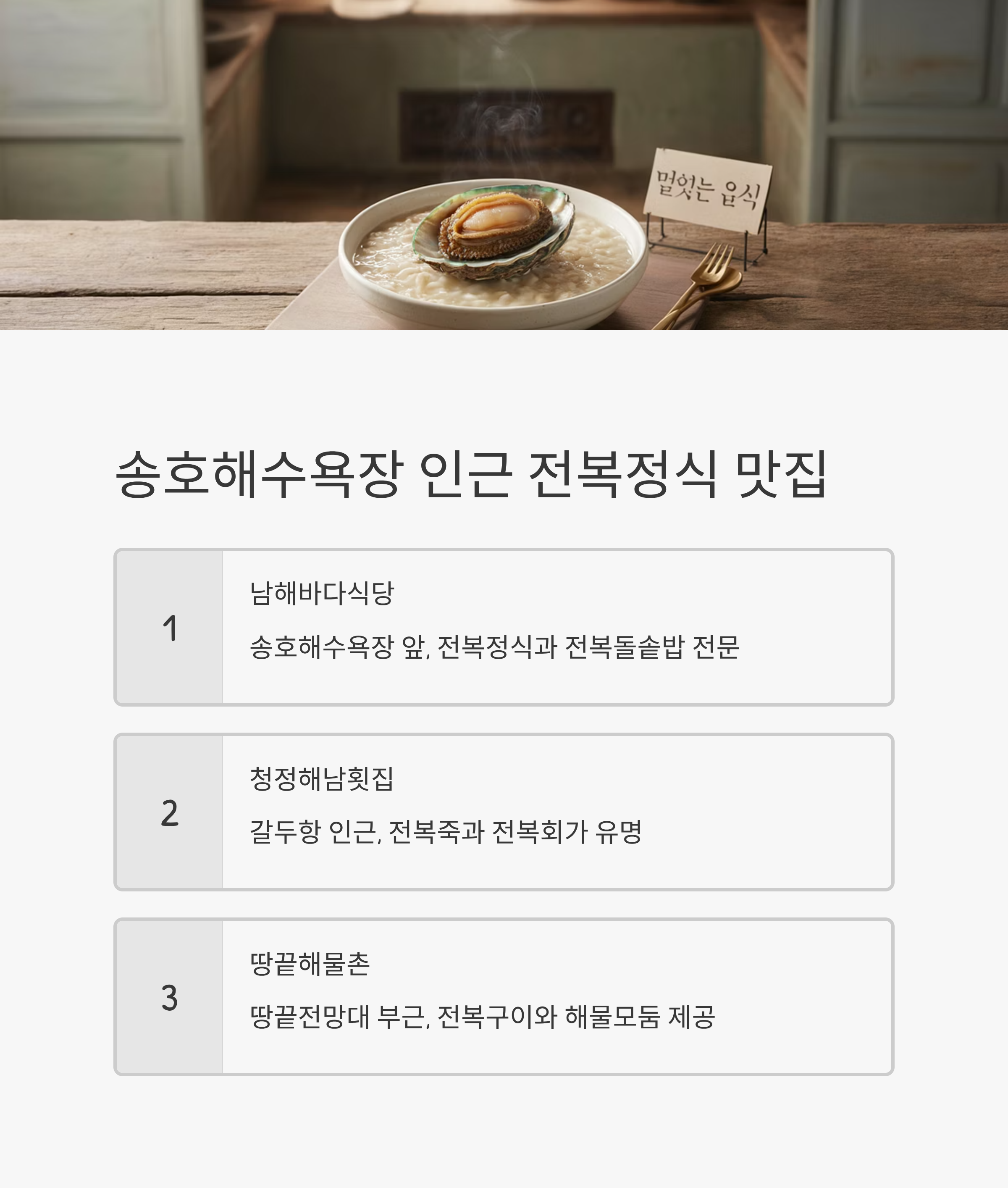 | 남해바다식당 | 송호해수욕장 앞 | 전복정식, 전복돌솥밥 |