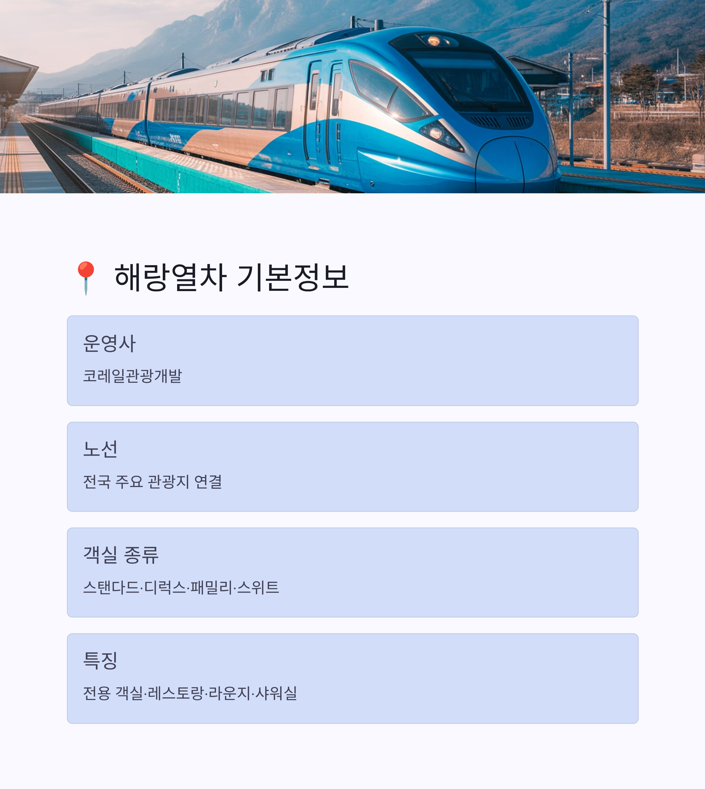 ‘움직이는 특급 호텔’이라고 불릴 만큼 럭셔리한 서비스로 유명해 부모님 효도여행이나 가족 기념여행으로 제격이에요. 오늘은 해랑열차 가격, 예약 방법, 객실 종류, 여행 코스까지 한눈에 정리해 드립니다.