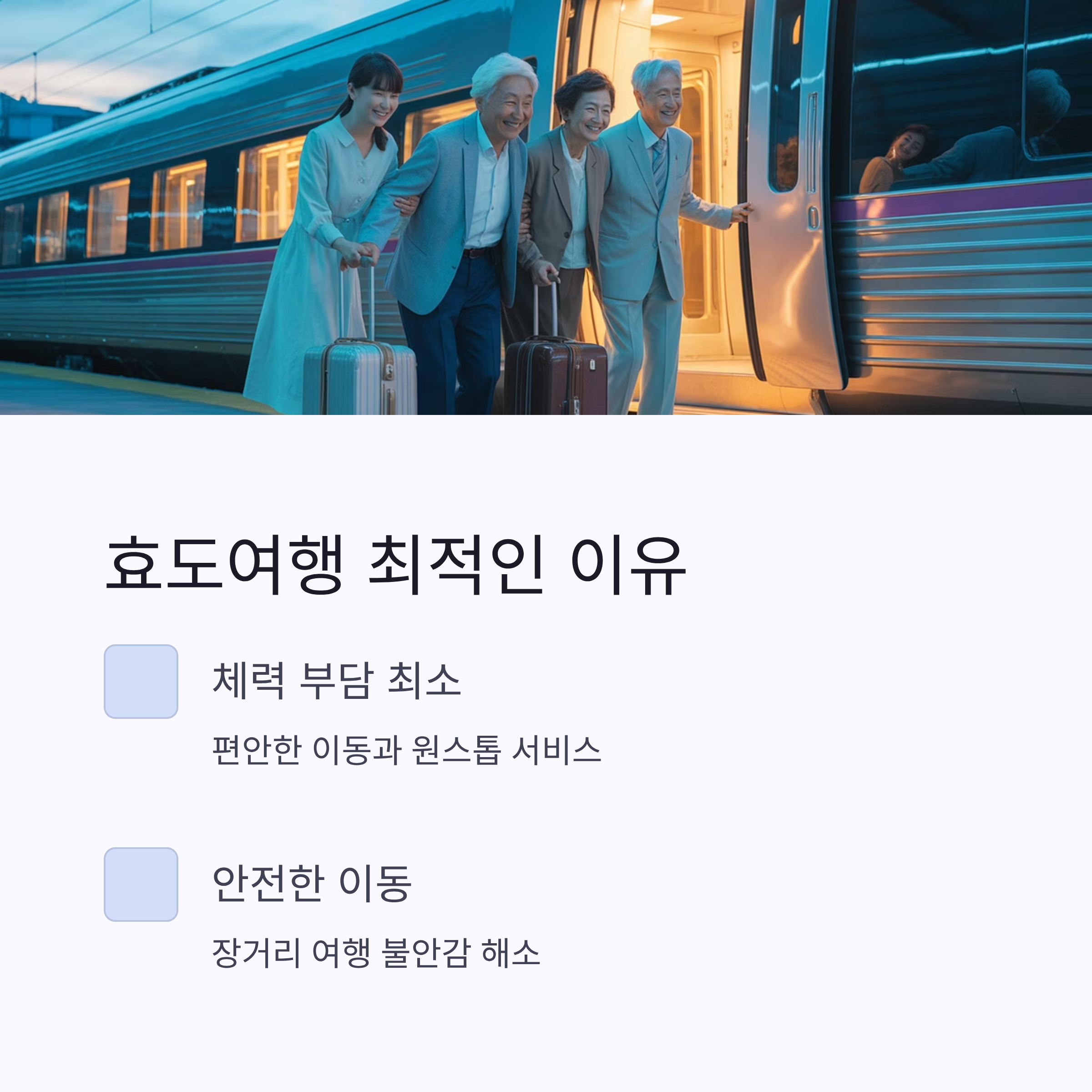 효도여행을 준비하는 자녀들에게 해랑열차는 최적의 선택이에요. 부모님들이 편안하게 앉아 이동하면서도 숙박, 식사, 관광까지 원스톱으로 제공되기 때문에 체력적으로 부담이 적어요. 또한 안전하게 기차로 이동하기 때문에 장거리 이동에 대한 불안감도 줄일 수 있죠.