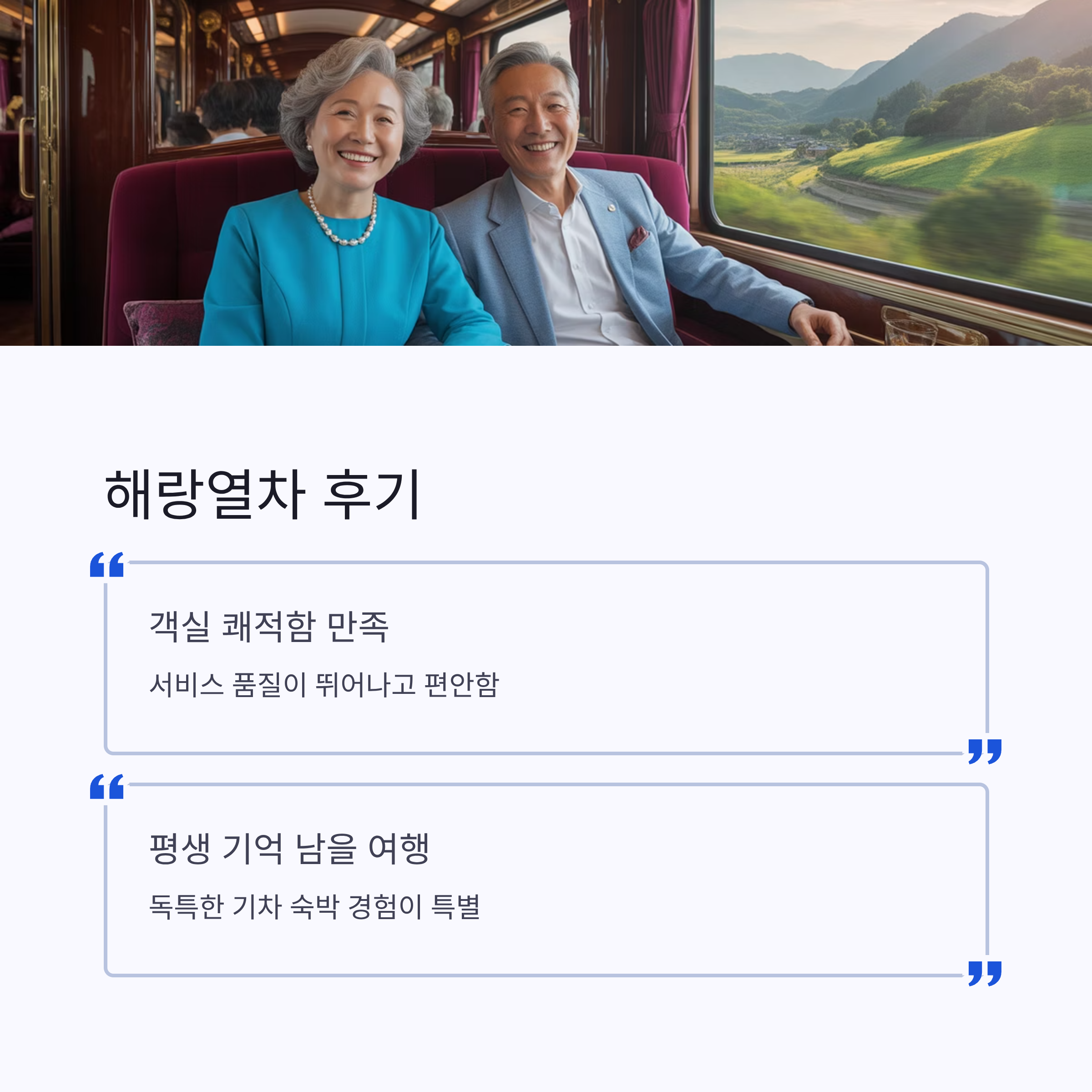 후기를 살펴보면 객실의 쾌적함과 서비스 만족도가 높다는 의견이 많아요. 특히 부모님을 모시고 가는 효도여행으로 인기가 많아요. 기차라는 독특한 공간에서 숙박하며 이동하는 경험 자체가 특별하기 때문에 평생 기억에 남을 여행이라는 후기가 많죠. 다만, 가격이 높은 편이라 가성비보다는 ‘가치 여행’에 초점을 두는 분들에게 추천돼요.