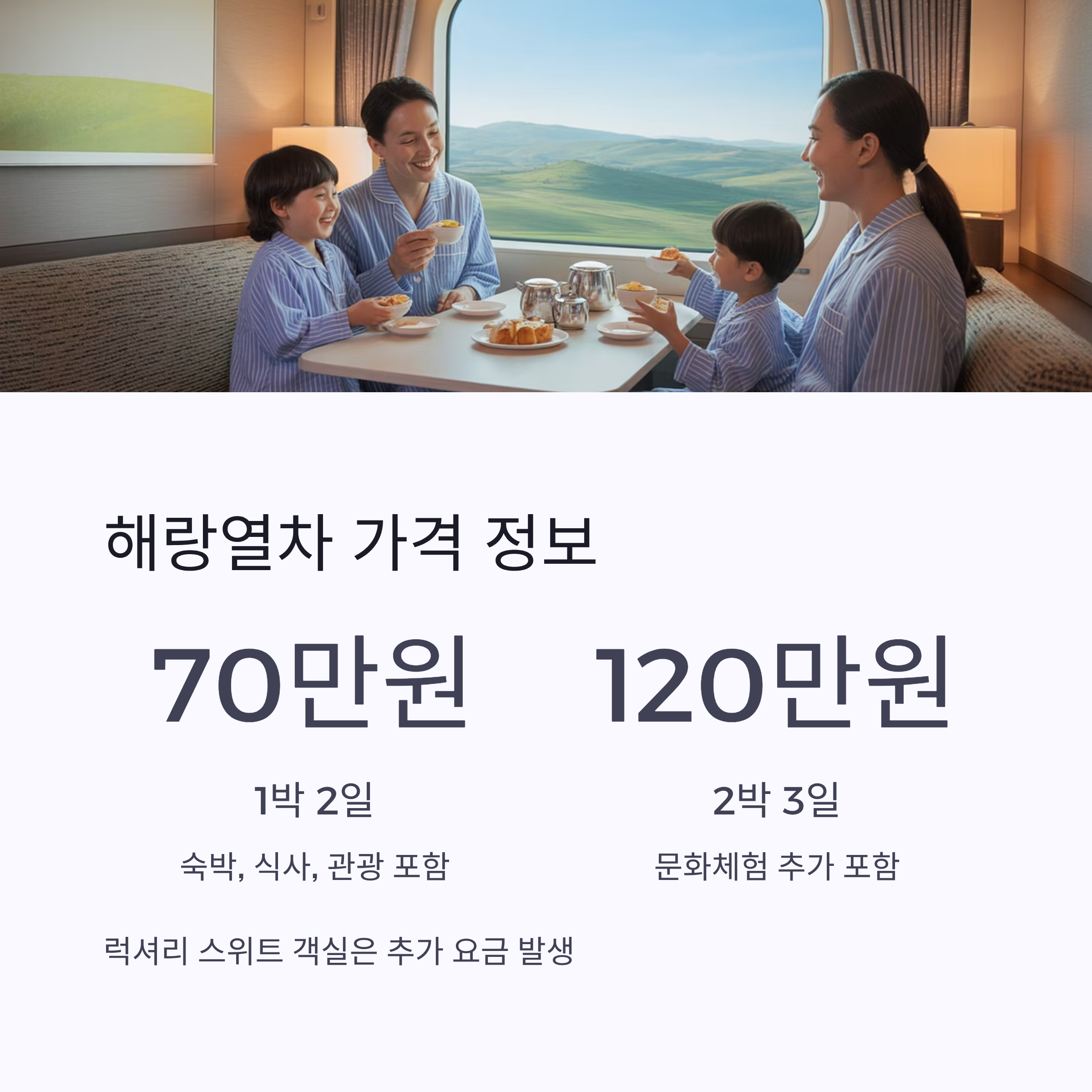 해랑열차 가격은 일정, 객실 타입, 시즌에 따라 다르게 책정돼요. 일반적인 기준으로 보면 다음과 같아요.