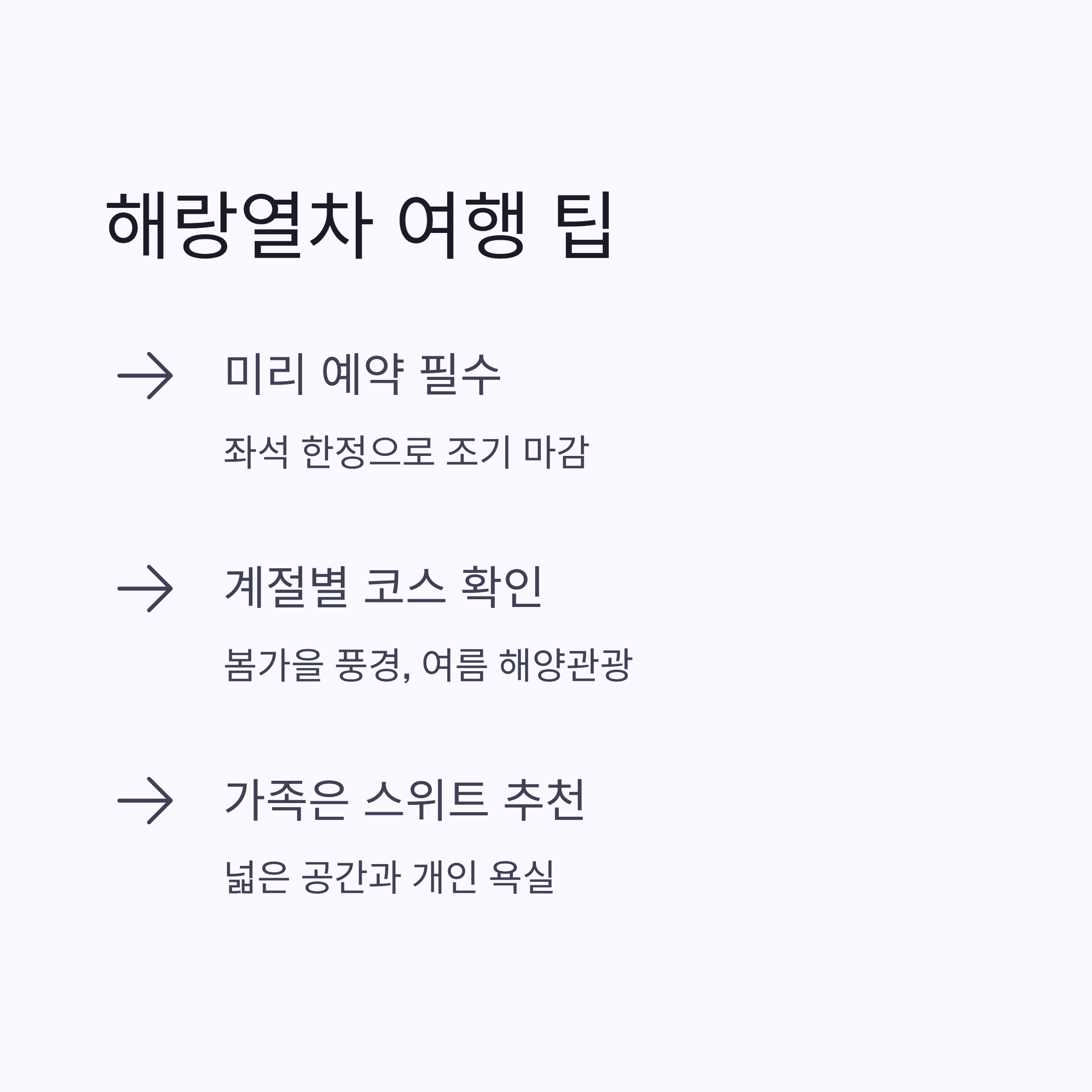 해랑열차는 단순한 이동이 아니라 여행 자체가 목적이 되는 특별한 기차예요. 가족과 함께하는 여행, 부모님께 드리는 효도여행으로 이만한 선택이 드물죠. 가격이 다소 높지만, 평생 기억에 남는 경험을 선물하고 싶다면 해랑열차만큼 완벽한 여행 수단은 없을 거예요.