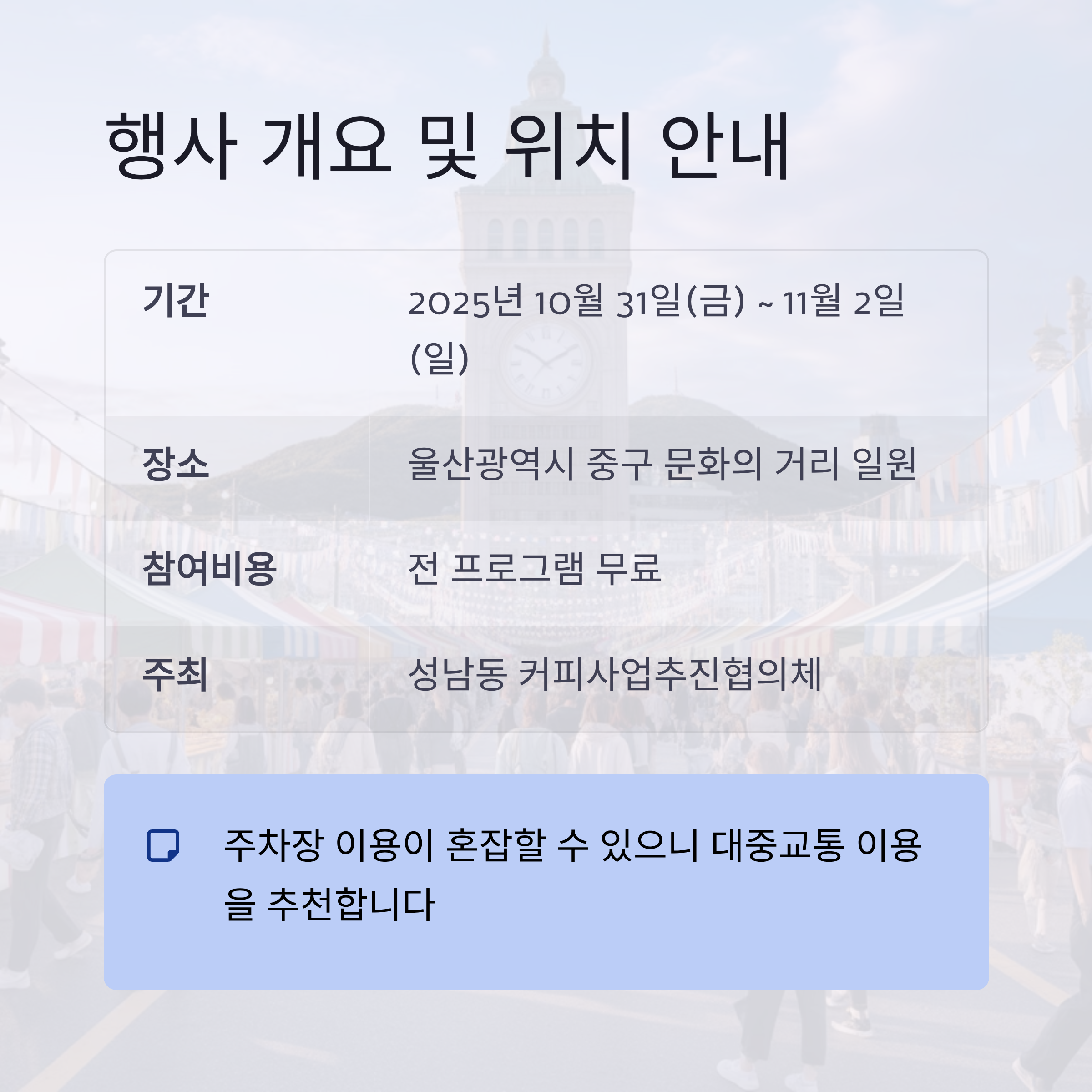 올해 성남동 커피페스티벌은 다음과 같이 운영됩니다.