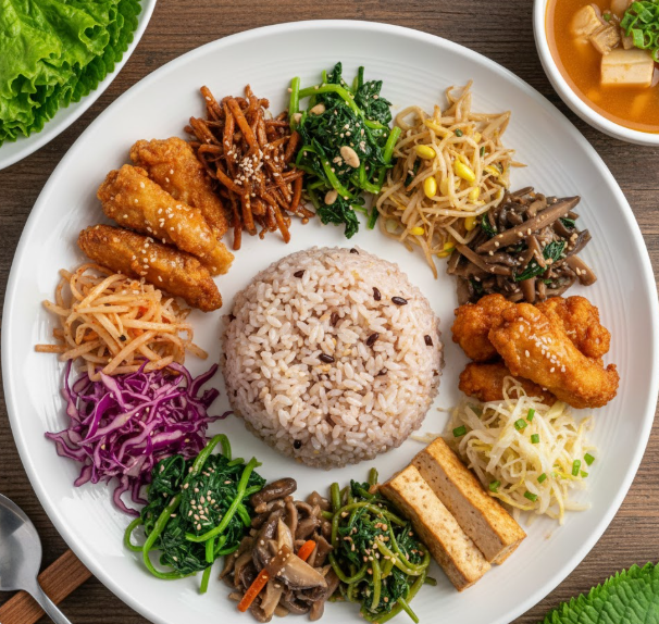 뜰안채는 의외로 탄수화물과 단백질 메뉴가 탄탄해요. 콩고기 메뉴와 다양한 잡곡밥, 그리고 따뜻한 국물 요리를 놓치지 마세요.