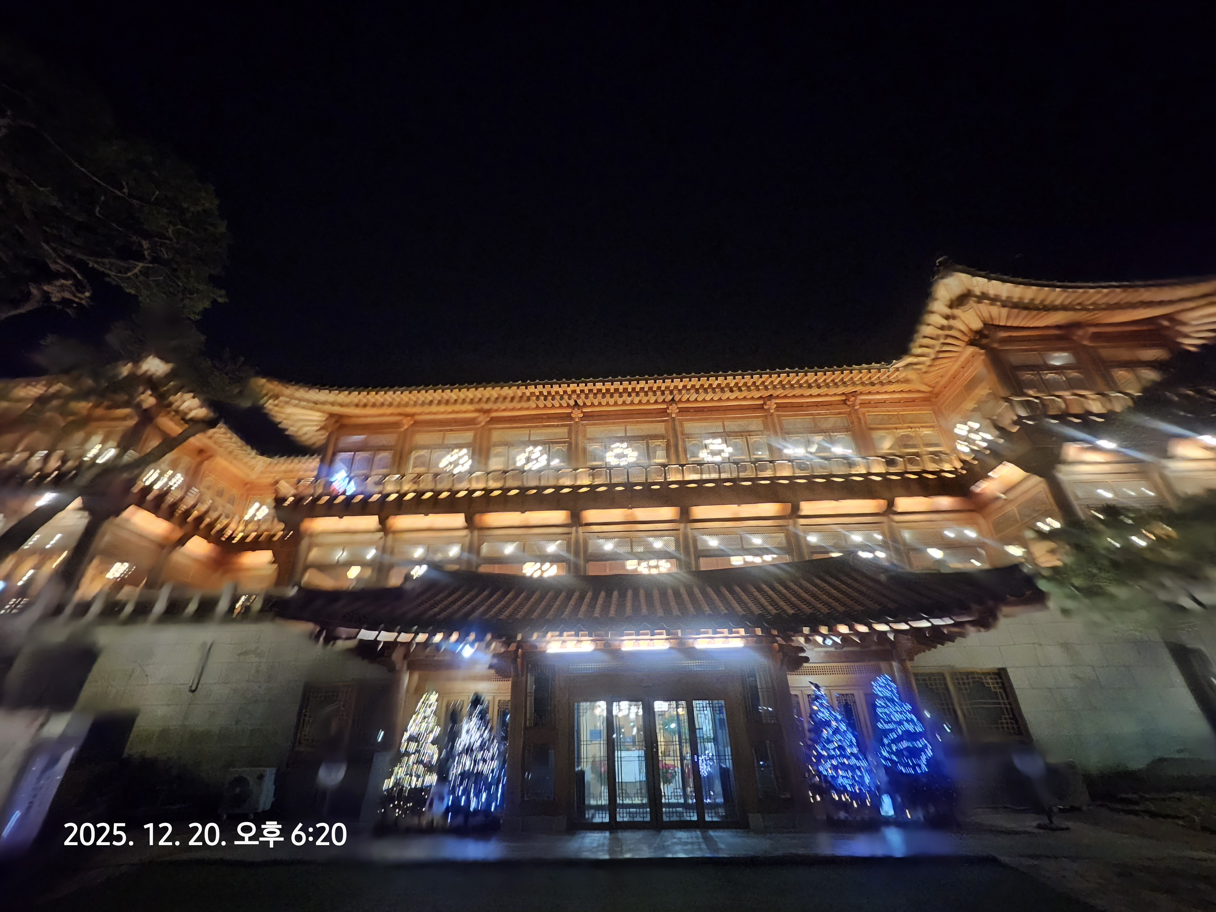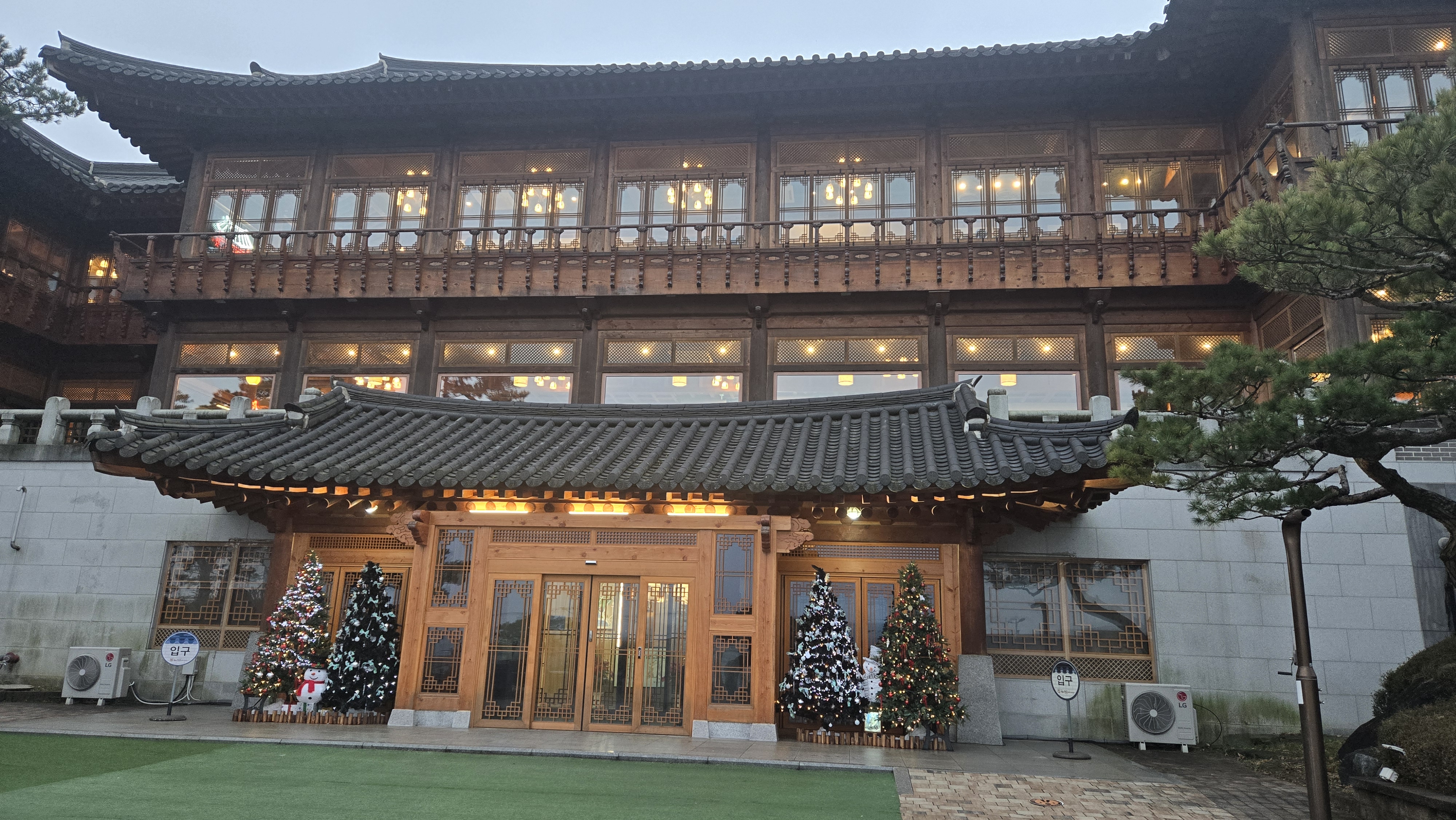 1. 본관 입구 대형 한옥을 배경으로 정면샷 한 장!