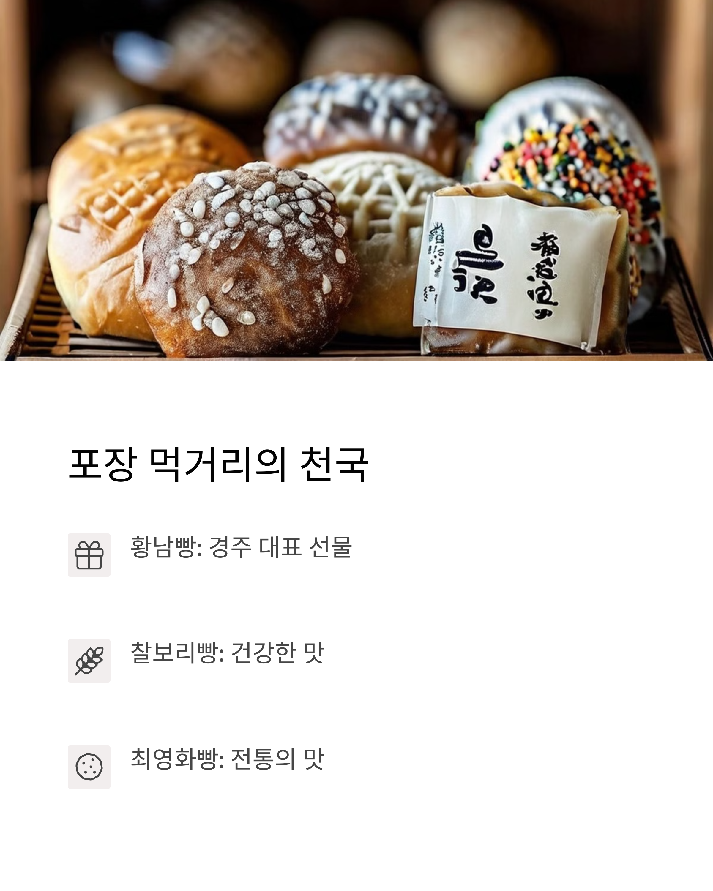 디저트를 즐기고 싶다면 한옥 감성이 물씬 풍기는 ‘서라’ 카페를 방문해 보세요. 초코 쌀 카스텔라와 크림 브륄레, 그리고 딸기자몽에이드는 무더운 날씨에도 기분 좋은 청량함을 선사합니다. 음료뿐만 아니라 포장 가능한 디저트까지 있어 선물용으로도 손색이 없습니다. 여행 마지막 날엔 황남빵과 찰보리빵을 포장하여 따뜻한 경주의 맛을 집으로 가져가보는 것도 좋습니다. 담백하고 촉촉한 식감이 그대로 살아 있어 오랜 여운을 남기게 됩니다.