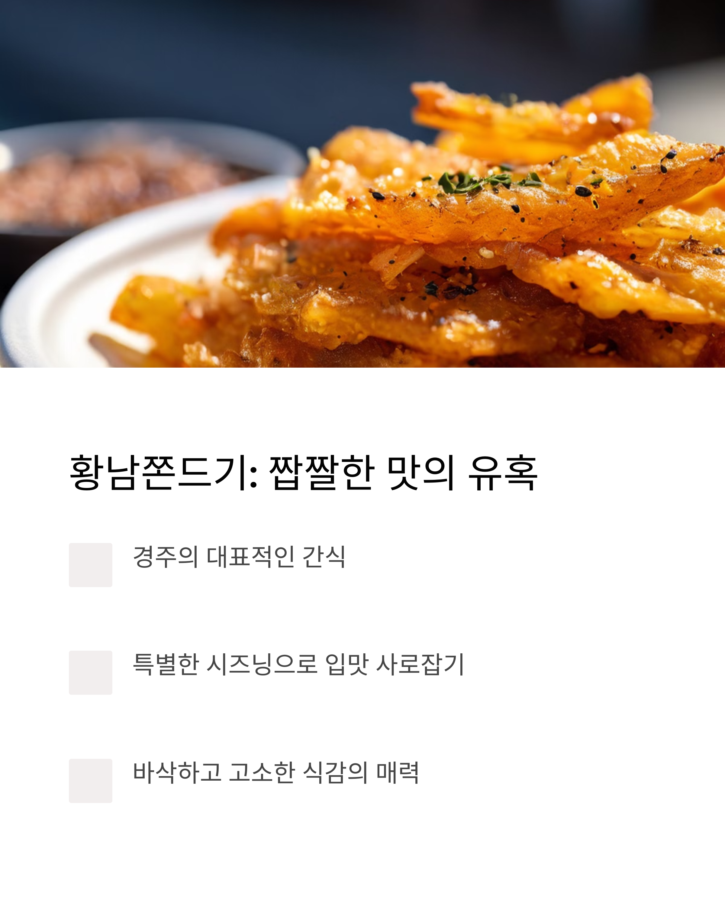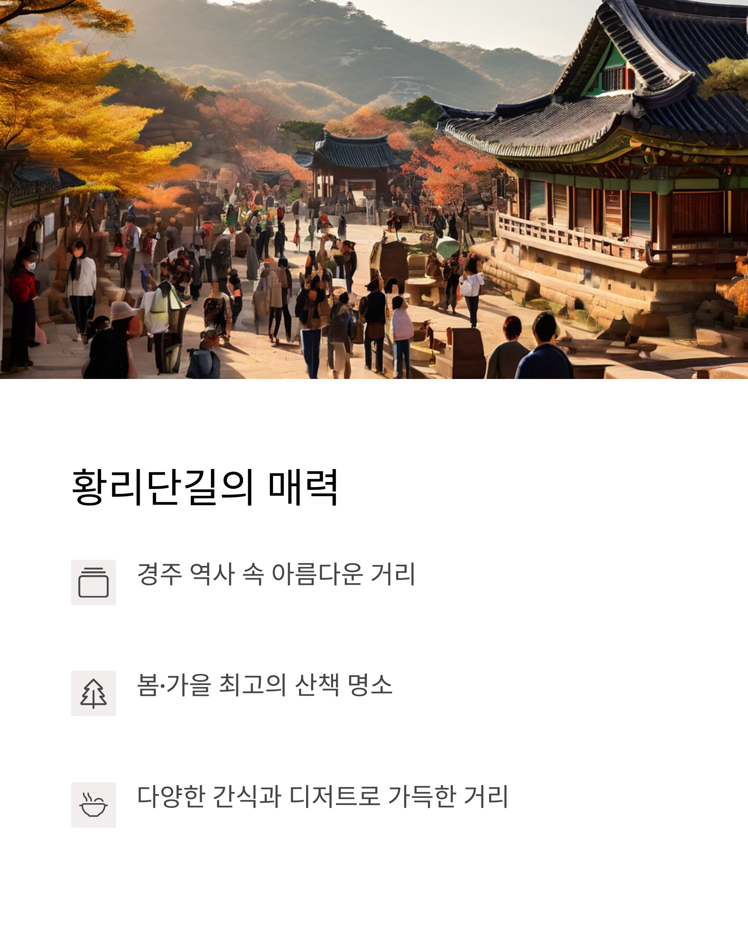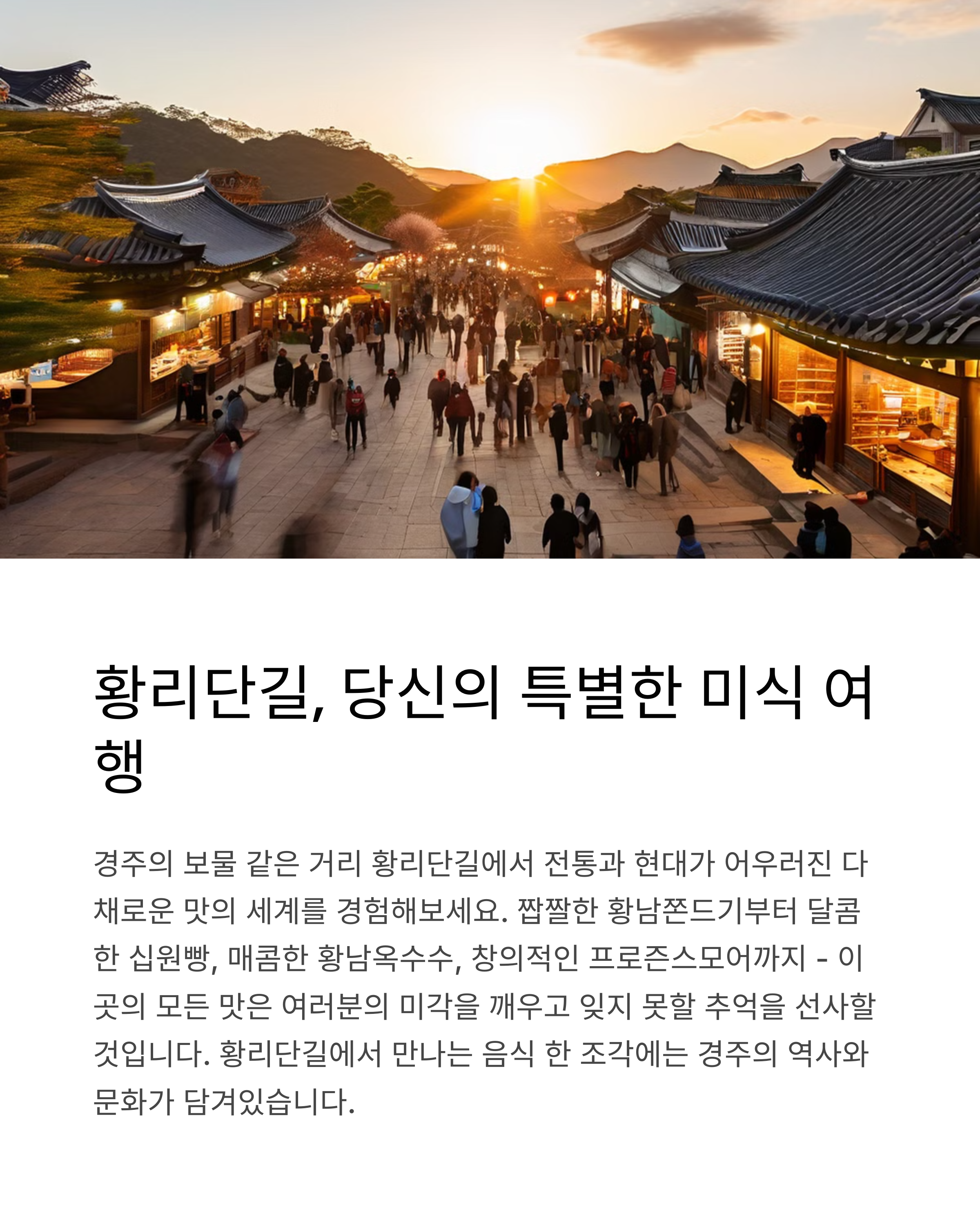 황리단길은 먹거리뿐만 아니라 풍경과 분위기, 사람들까지도 여행의 설렘을 더해주는 소중한 장소입니다. 이번 계절, 간식과 디저트를 천천히 음미하며 걷는 그 길에서 자신만의 소중한 추억을 만들어보세요. 카페 한편에서 바라보는 골목의 정취, 손에 들린 쫀득한 간식 하나로도 일상에 활기를 더할 수 있습니다. 황리단길에서의 하루는 분명히 당신의 여행 앨범에 특별한 한 페이지가 될 것입니다.