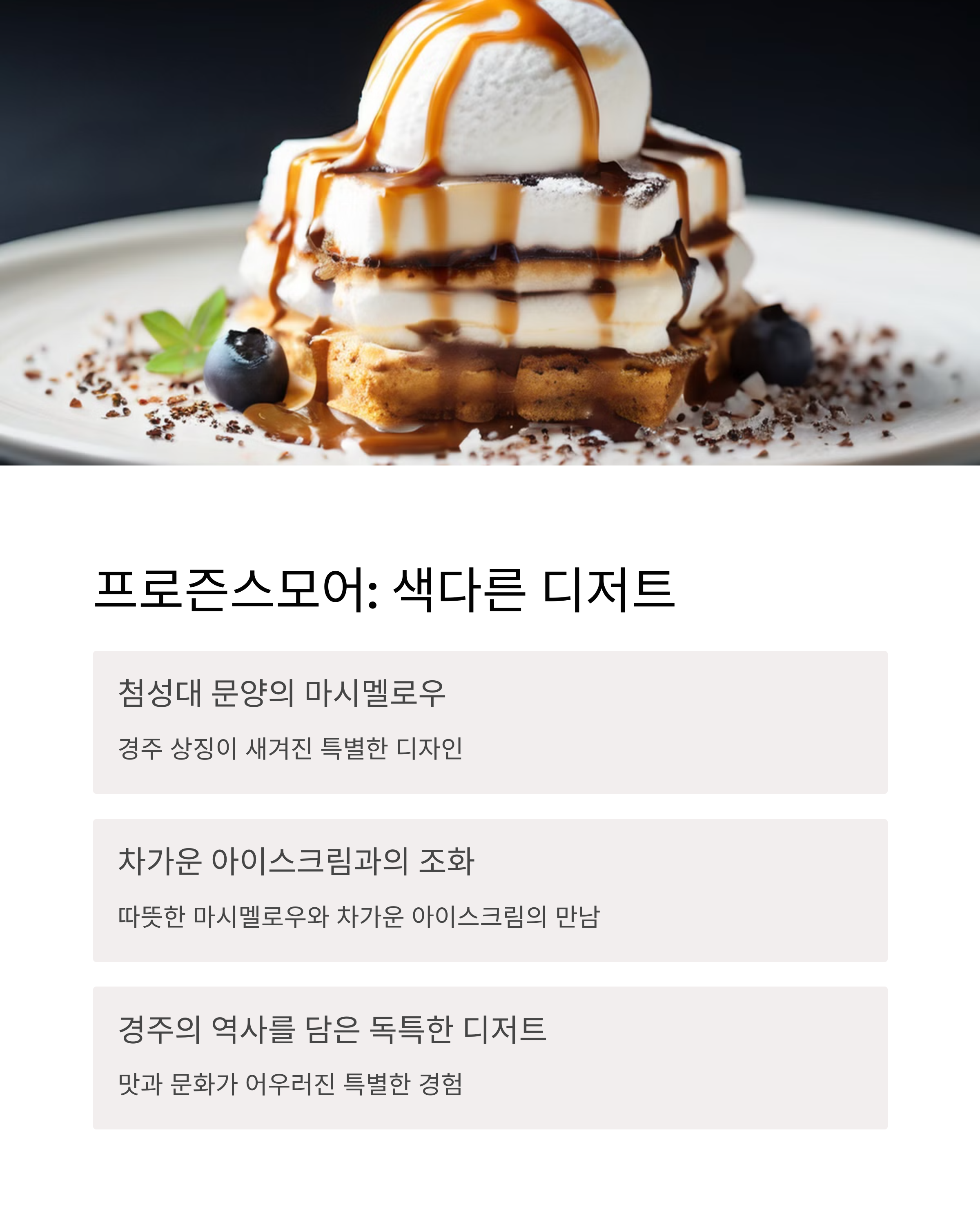 간식을 찾는다면 황남쫀드기를 꼭 맛보시길 추천드립니다. 짭짤하면서도 중독성 있는 맛으로, 현지인과 관광객 모두에게 사랑받고 있습니다. 또 다른 인기 간식 십원빵은 귀여운 비주얼에 치즈가 가득 들어 있어 간단하게 즐기기에 제격이지요. 프로즌스모어는 첨성대 문양이 들어간 독특한 비주얼과 쫀득한 마시멜로우, 차가운 아이스크림이 절묘하게 어우러진 특별 간식입니다. 걷다가 만나는 작은 푸드트럭과 간식 가게들이 황리단길의 매력을 더해줍니다.