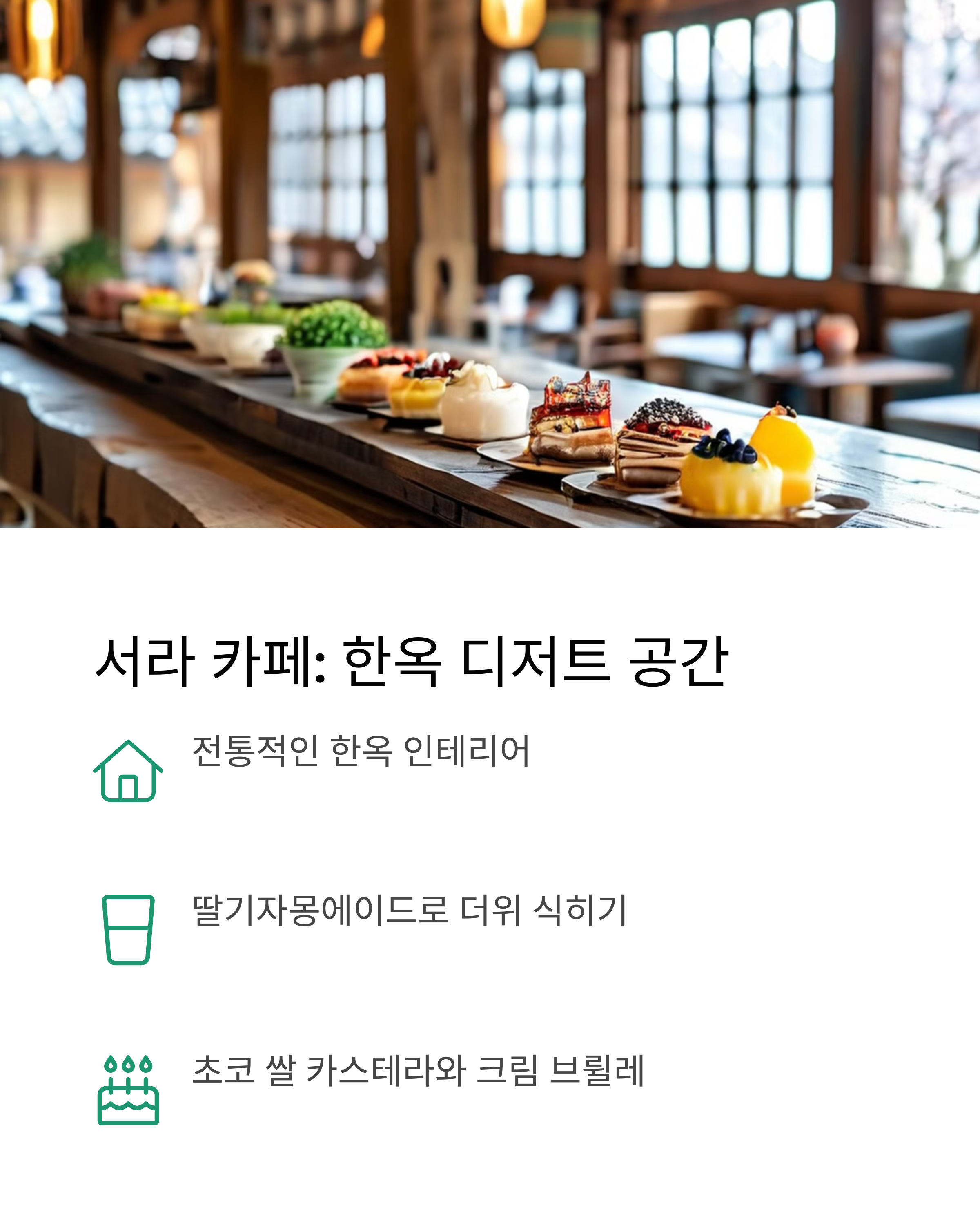 | 감성 디저트 카페 | 서라에서 청량감 있는 음료와 디저트를 즐겨요. |