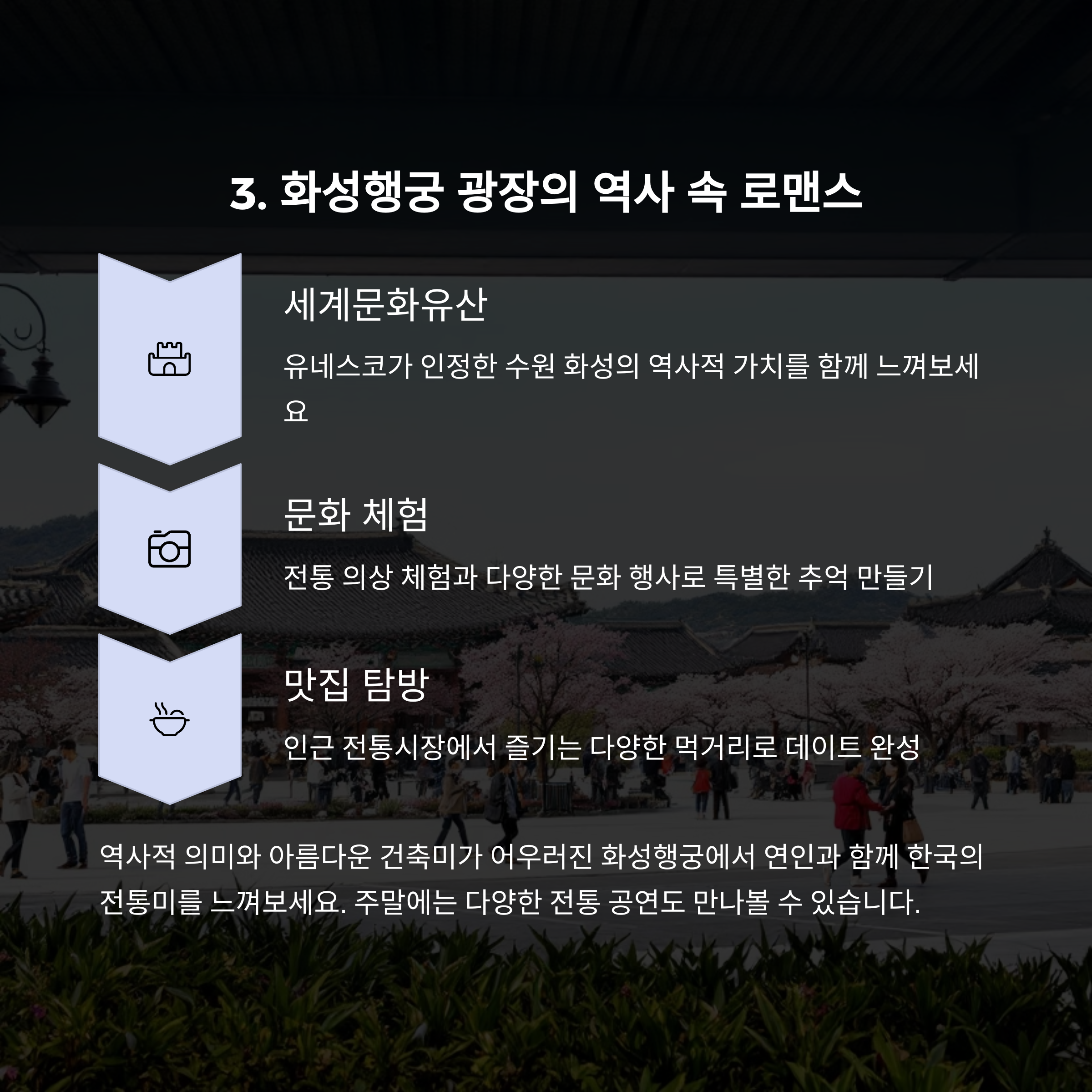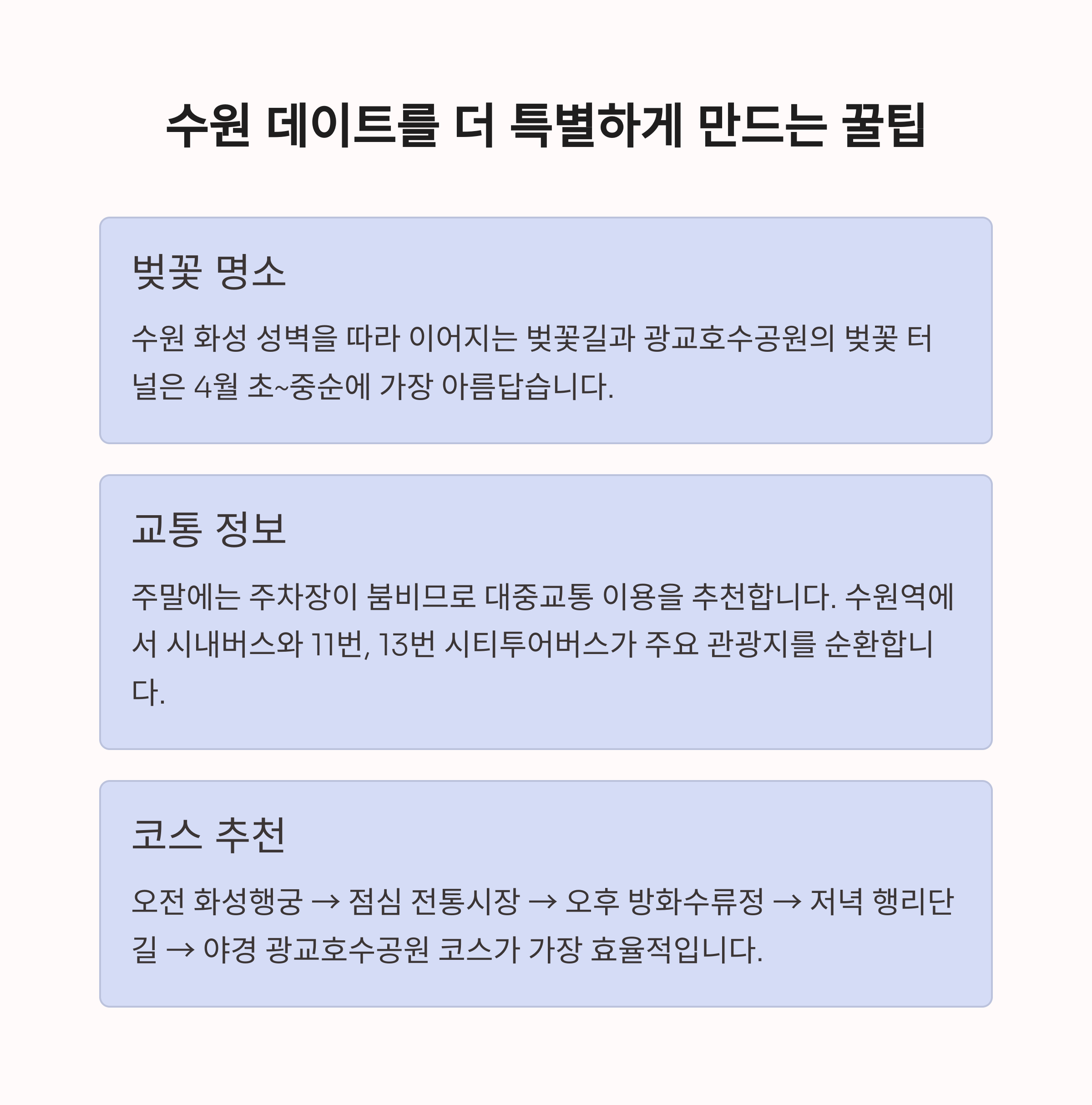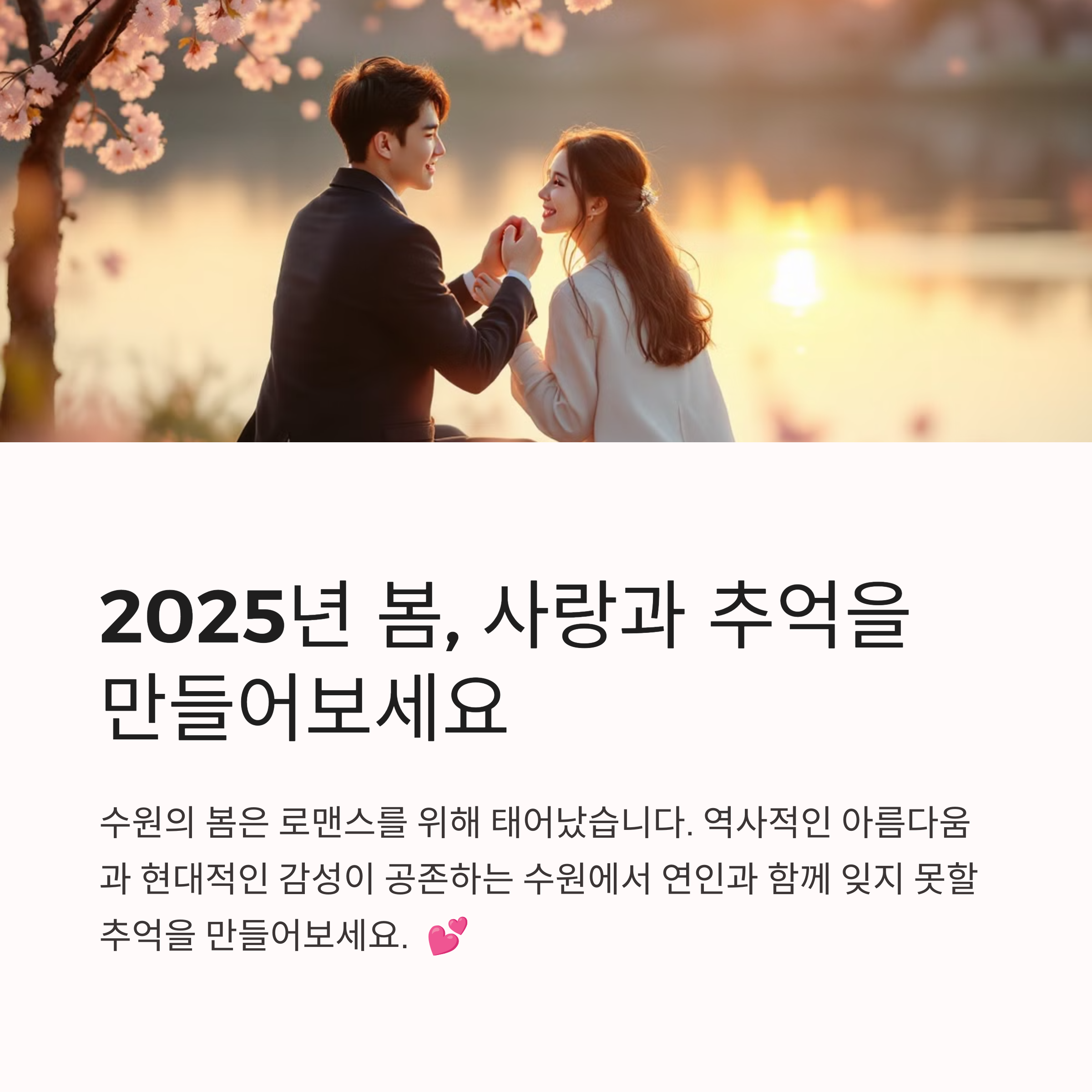 봄은 사랑을 더욱 빛나게 해주는 계절입니다. 수원의 다채로운 매력을 느낄 수 있는 5개의 데이트 명소는 단순한 장소를 넘어, 소중한 사람과의 추억을 새기는 공간이 되어줄 것입니다. 이번 주말, 또는 특별한 날을 위해 준비한 수원의 핫플레이스를 참고하셔서 잊지 못할 하루를 계획해 보시기 바랍니다.