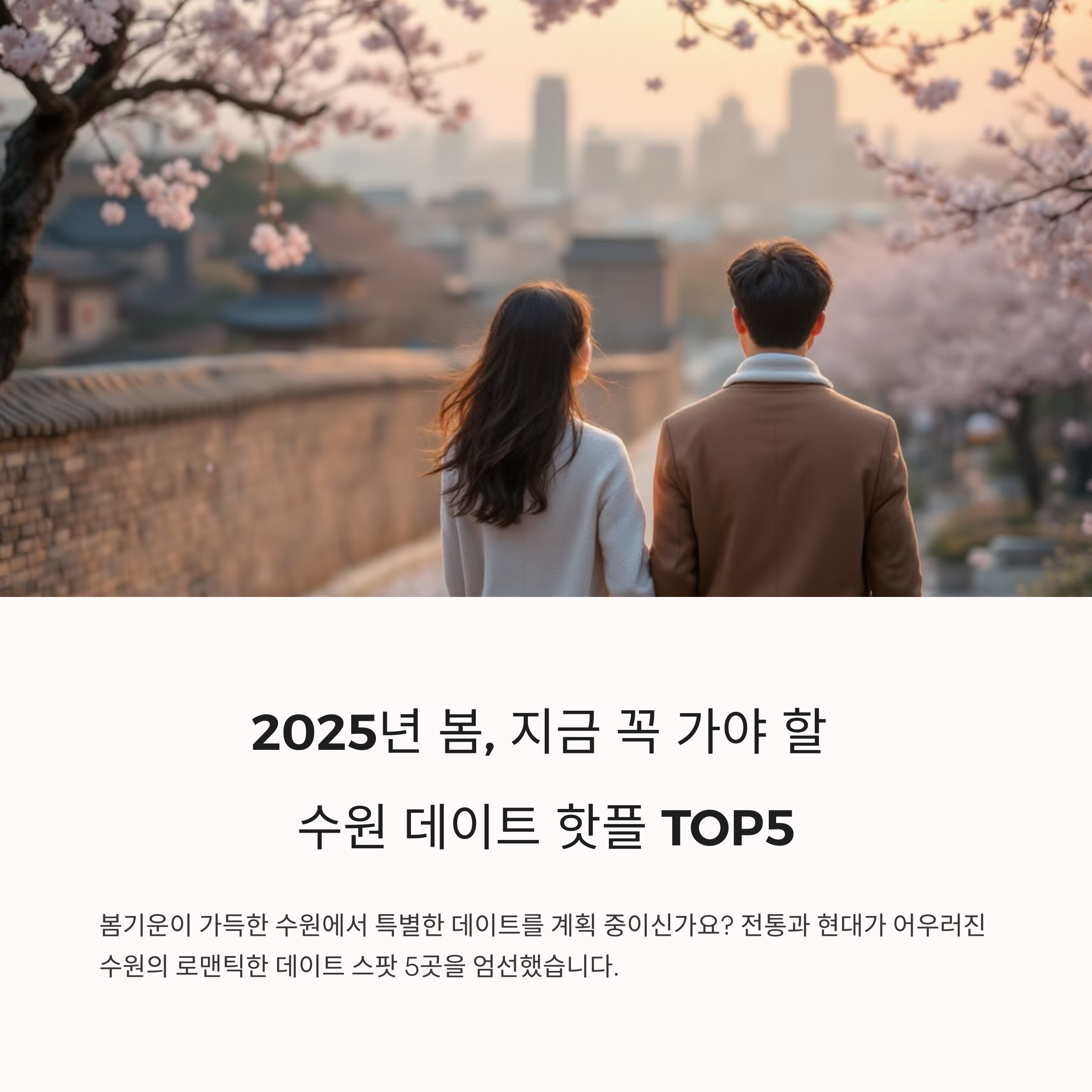 특히 2025년 봄에는 벚꽃이 피는 시기에 맞춰 연인과의 추억을 더욱 깊이 남길 수 있는 명소들이 많아 더욱 기대가 됩니다. 이번 포스팅에서는 수원 지역에서 주목받고 있는 TOP 5 데이트 핫플레이스를 엄선하여 소개드리며, 여러분의 데이트 일정에 도움이 되는 다양한 팁도 함께 안내드릴 예정입니다. 지금부터 설레는 수원의 봄으로 함께 떠나보세요!