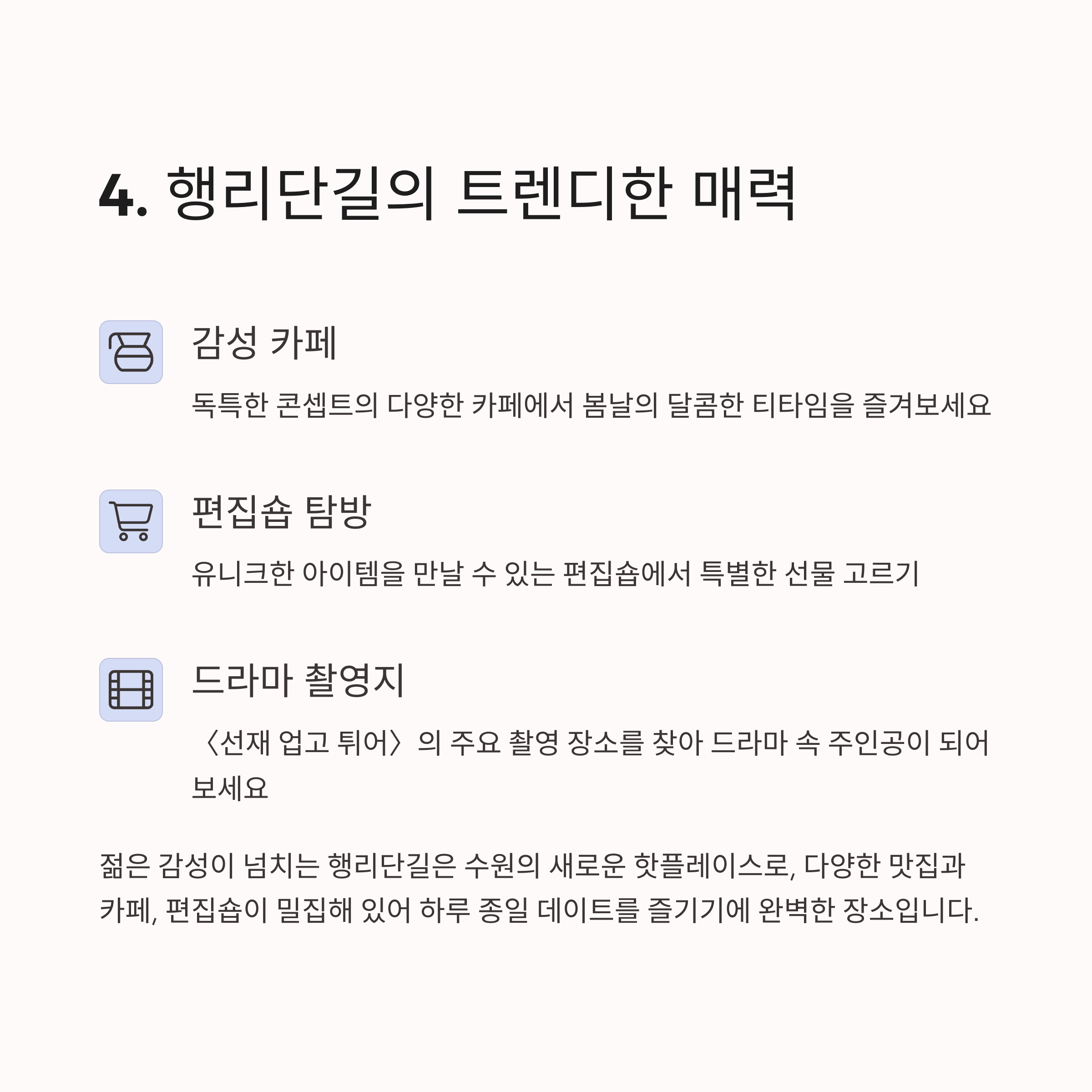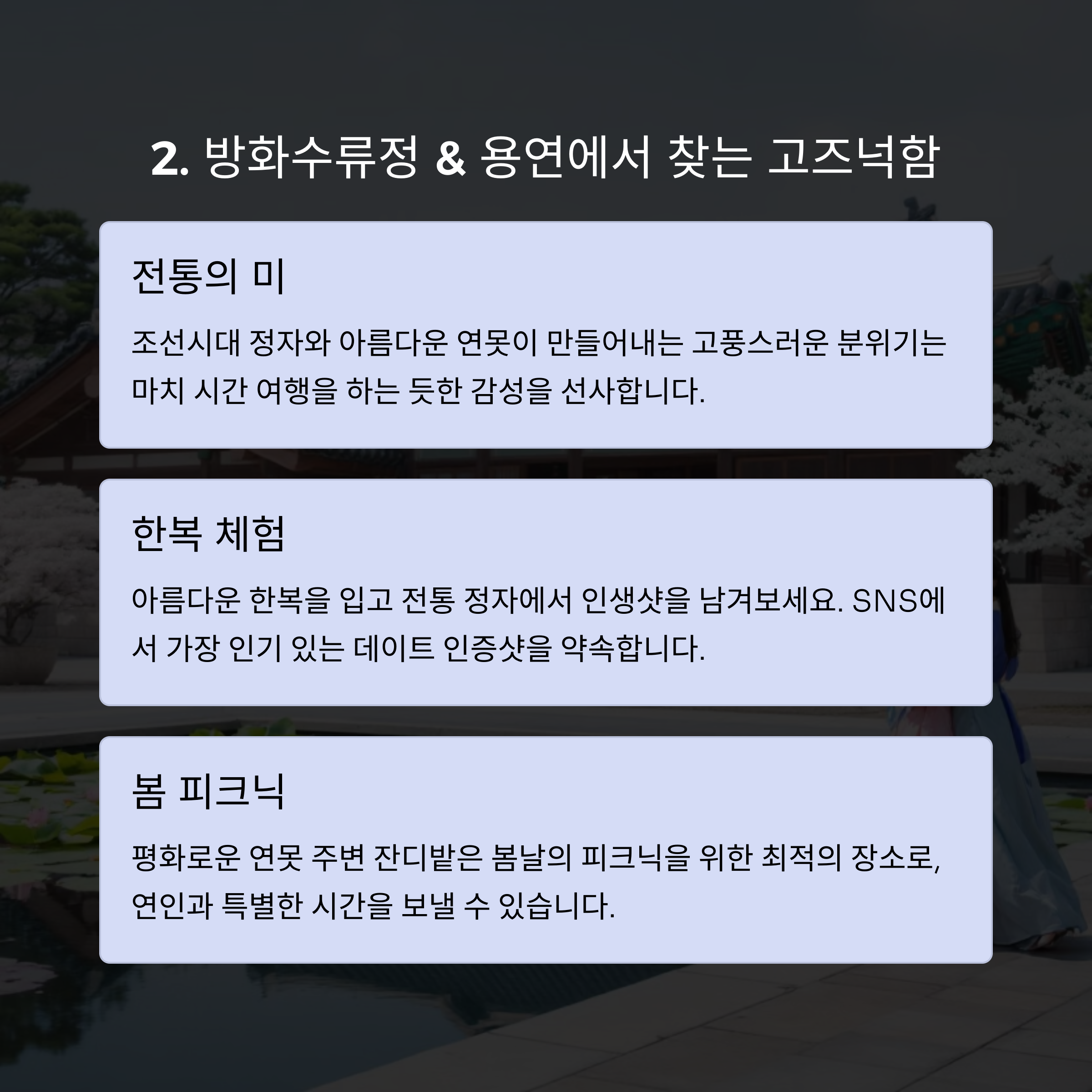 | 잔디밭과 벤치에서 여유로운 시간 보내기 | 한복 체험으로 추억 남기기 | 핫플레이스 구경하며 감성 사진 찍기 |