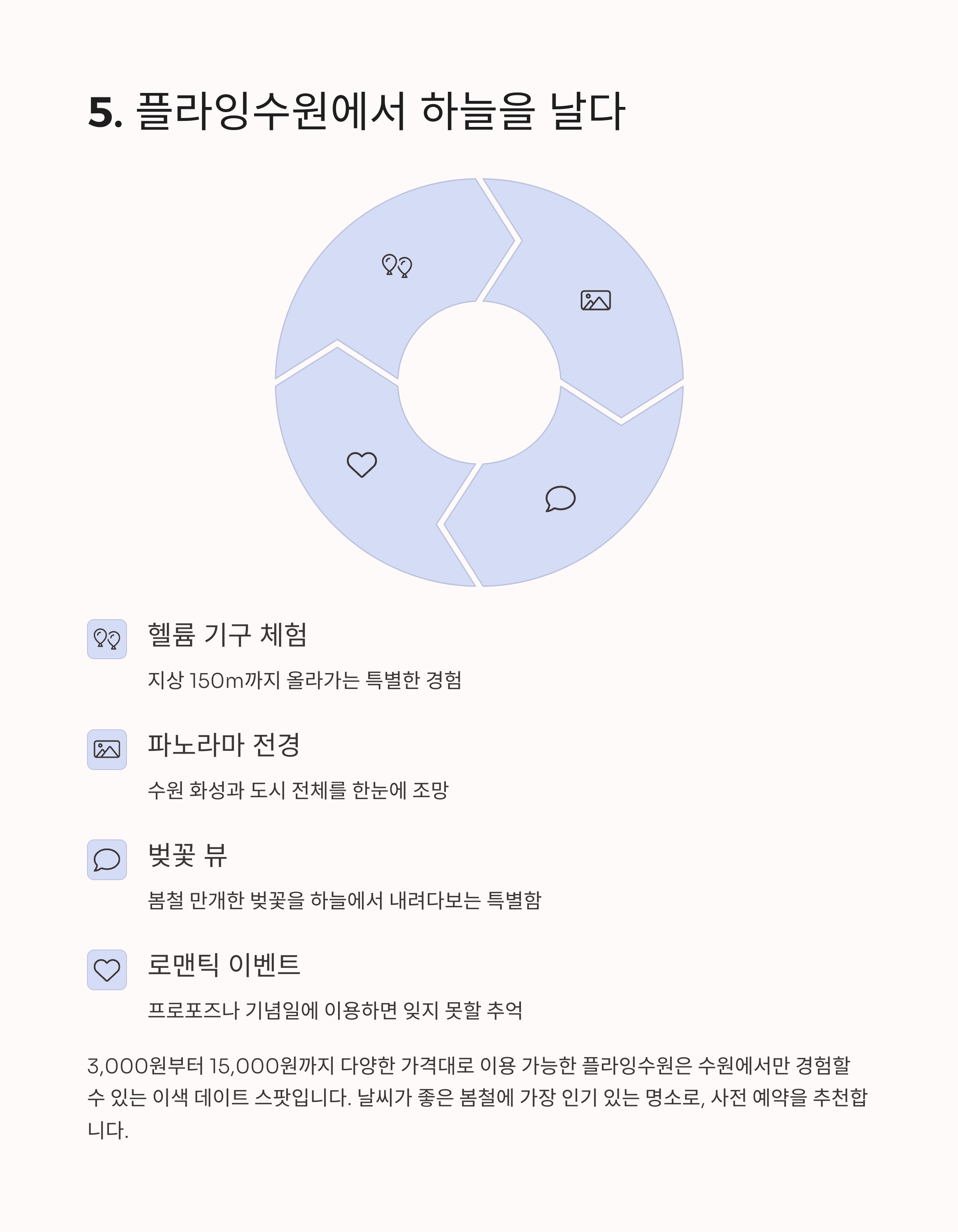 광교호수공원에서 여유를 느끼고, 방화수류정에서 전통과 고요함을 마주하며, 행리단길에서 감성을 충전해 보세요. 헬륨 기구로 떠나는 플라잉수원은 평범한 데이트를 특별하게 만들어줄 마법 같은 순간을 선사할 것입니다. 소중한 사람에게 아름다운 추억을 선물하고 싶다면, 지금이 바로 그때입니다.