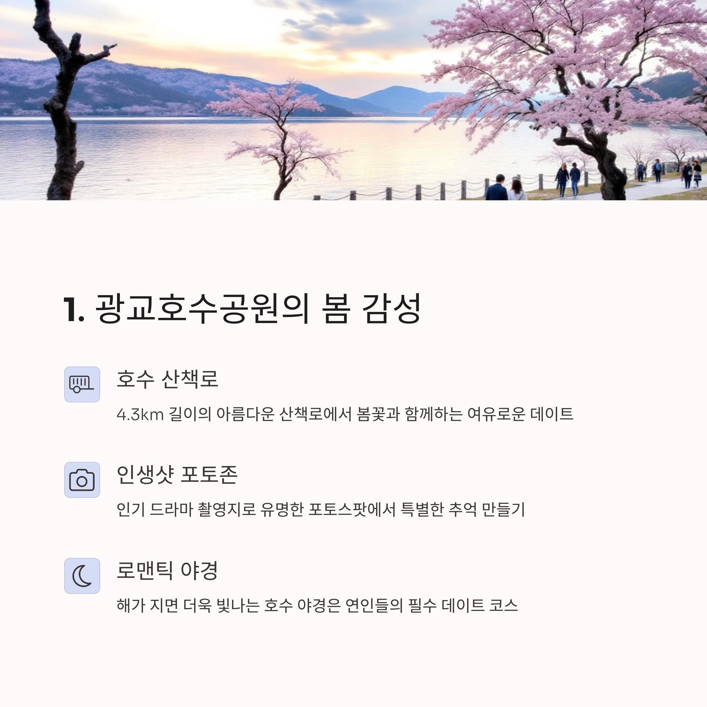 | 넓은 호수와 벚꽃길 산책, 감성 야경 | 조용한 정원, 연못 주변 피크닉 명소 | 감성 카페와 드라마 촬영지 데이트 명소 |