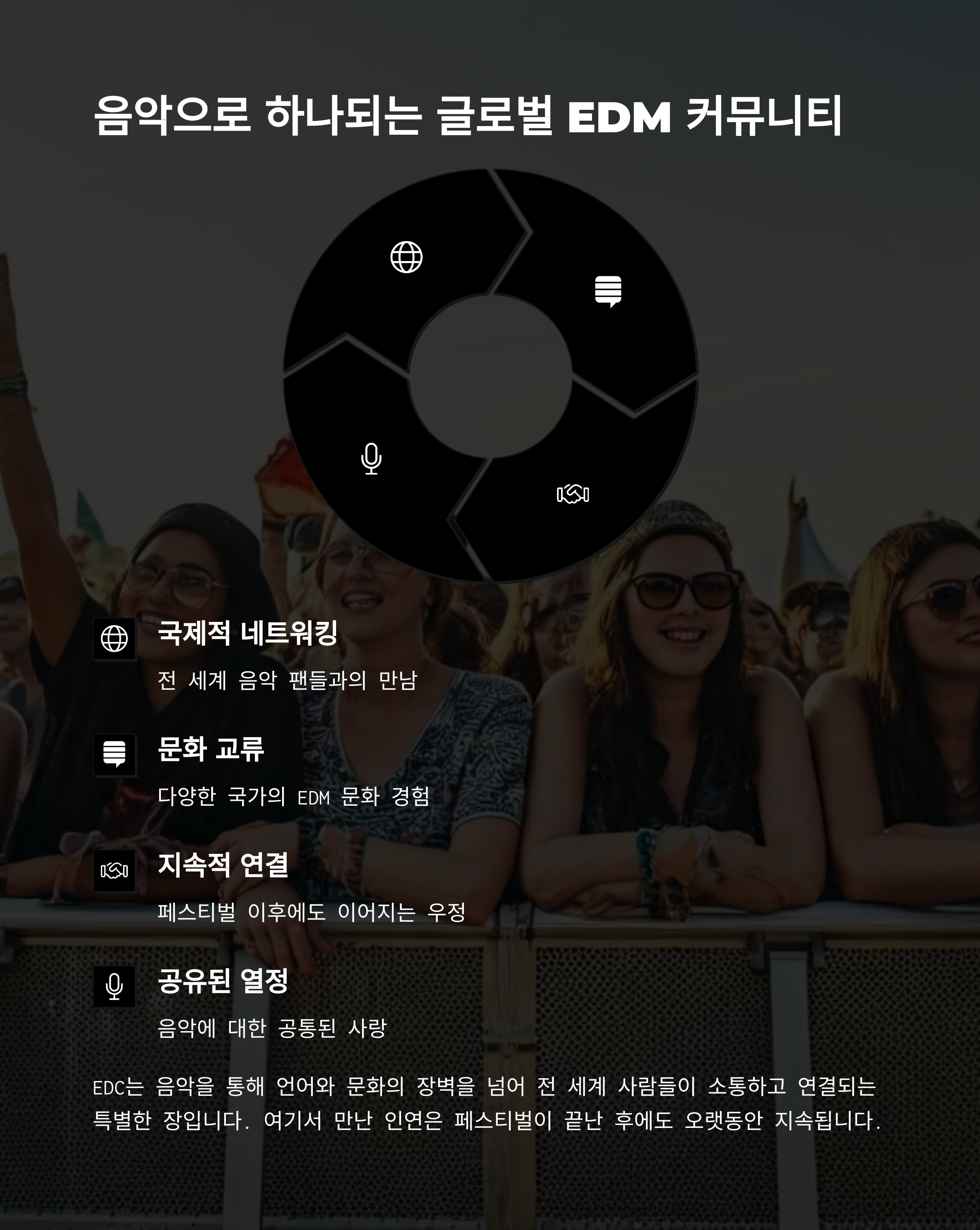또한, 포용적이고 따뜻한 문화 환경을 통해 EDM 팬이든 처음이라도 누구나 함께 즐길 수 있는 특별한 공간을 제공합니다.